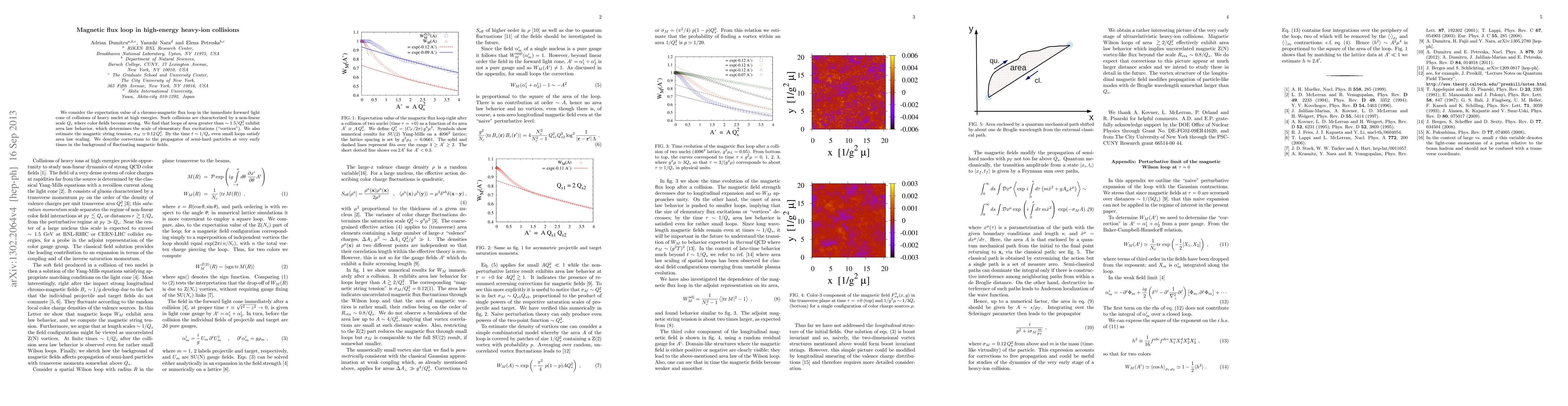 We consider the expectation value of a magnetic flux loop in the immediate forward light cone of collisions of heavy nuclei at high energies. Such collisions are characterized by a non-linear scale Q_s where color fields become strong. We find that loops of area greater than ~2/Q_s^2 exhibit area law behavior, which determines the scale of elementary flux excitations ("vortices"). We also estimate the magnetic string tension, sigma_M = 0.12 Q_s^2. By the time t ~ 1/Q_s even small loops satisfy an area law. We describe corrections to the propagator of semi-hard gluons at very early times in the background of fluctuating magnetic fields.