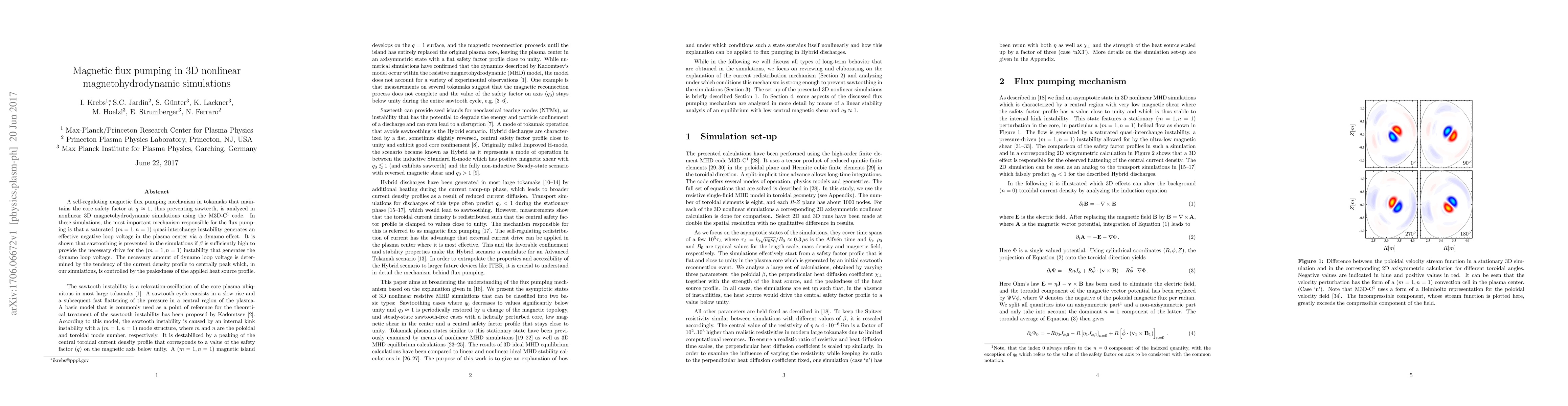 A self-regulating magnetic flux pumping mechanism in tokamaks that maintains the core safety factor at $q\approx 1$, thus preventing sawteeth, is analyzed in nonlinear 3D magnetohydrodynamic simulations using the M3D-C$^1$ code. In these simulations, the most important mechanism responsible for the flux pumping is that a saturated $(m=1,n=1)$ quasi-interchange instability generates an effective negative loop voltage in the plasma center via a dynamo effect. It is shown that sawtoothing is prevented in the simulations if $\beta$ is sufficiently high to provide the necessary drive for the $(m=1,n=1)$ instability that generates the dynamo loop voltage. The necessary amount of dynamo loop voltage is determined by the tendency of the current density profile to centrally peak which, in our simulations, is controlled by the peakedness of the applied heat source profile.