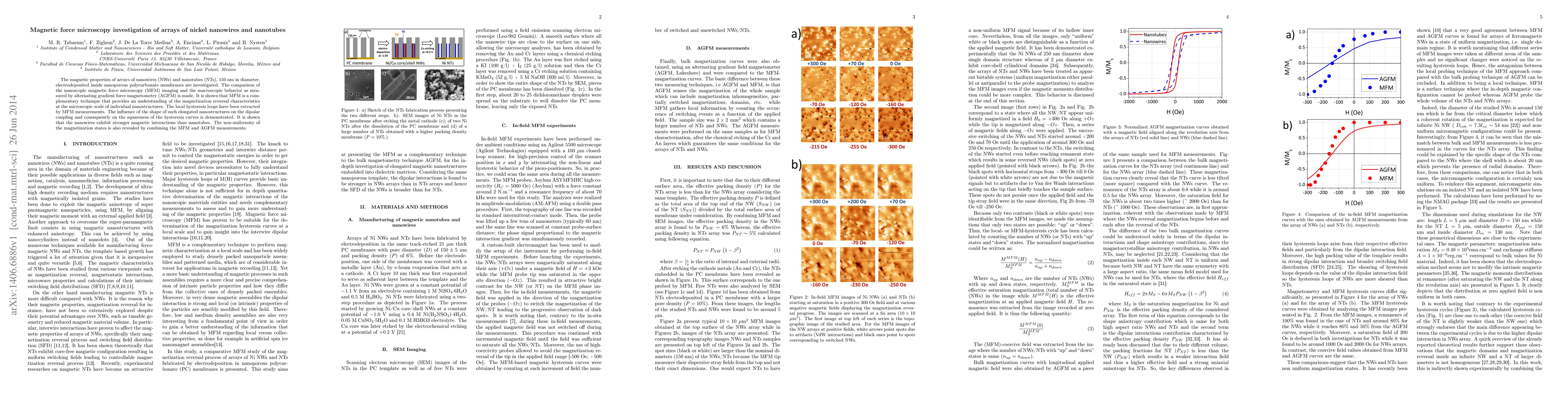 This study investigates the magnetic properties of nickel nanowires and nanotubes using magnetic force microscopy (MFM) and alternating gradient force magnetometry (AGFM). MFM reveals magnetization reversal characteristics at the nanoscale, showing stronger magnetic interactions in nanowires compared to nanotubes due to shape-dependent dipolar coupling.