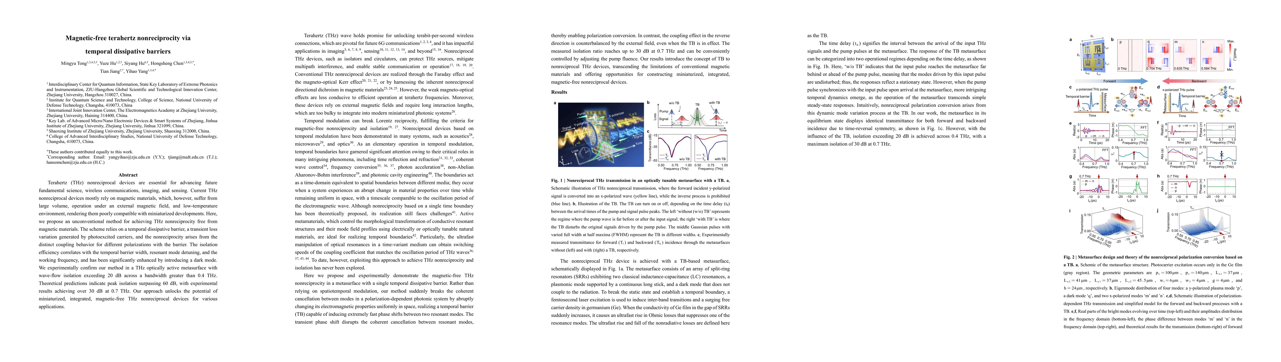 Terahertz (THz) nonreciprocal devices are essential for advancing future fundamental science, wireless communications, imaging, and sensing. Current THz nonreciprocal devices mostly rely on magnetic materials, which, however, suffer from large volume, operation under an external magnetic field, and low-temperature environment, rendering them poorly compatible with miniaturized developments. Here,we propose an unconventional method for achieving THz nonreciprocity free from magnetic materials. The scheme relies on a temporal dissipative barrier, a transient loss variation generated by photoexcited carriers, and the nonreciprocity arises from the distinct coupling behavior for different polarizations with the barrier. The isolation efficiency correlates with the temporal barrier width, resonant mode detuning, and the working frequency, and has been significantly enhanced by introducing a dark mode. We experimentally confirm our method in a THz optically active metasurface with wave-flow isolation exceeding 20 dB across a bandwidth greater than 0.4 THz. Theoretical predictions indicate peak isolation surpassing 60 dB, with experimental results achieving over 30 dB at 0.7 THz. Our approach unlocks the potential of miniaturized, integrated, magnetic-free THz nonreciprocal devices for various applications.