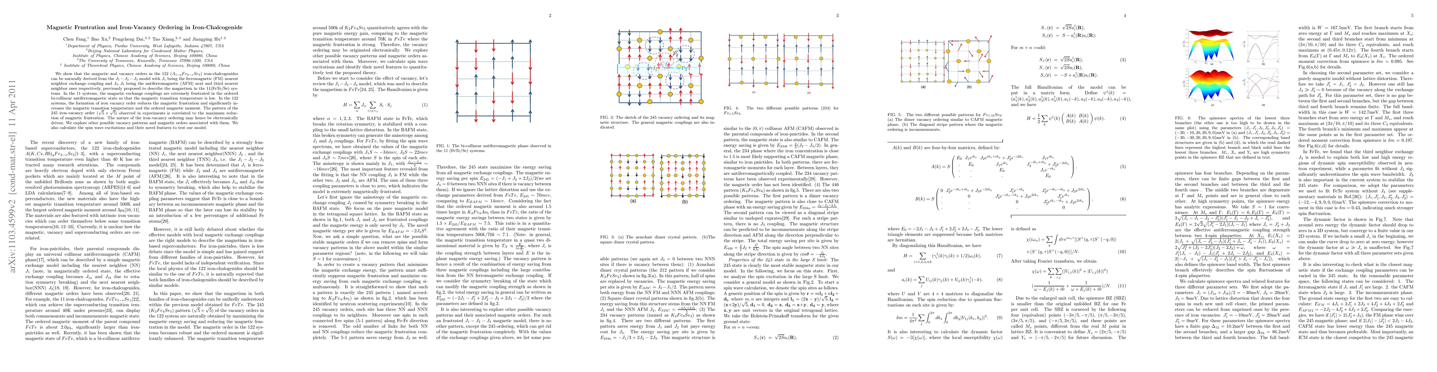 We show that the magnetic and vacancy orders in the 122 $(A_{1-y}Fe_{2-x}Se_2)$ iron-chalcogenides can be naturally derived from the $J_1-J_2-J_3$ model with $J_1$ being the ferromagnetic (FM) nearest neighbor exchange coupling and $J_{2}, J_3$ being the antiferromagnetic (AFM) next and third nearest neighbor ones respectively, previously proposed to describe the magnetism in the 11(FeTe/Se) systems. In the 11 systems, the magnetic exchange couplings are extremely frustrated in the ordered bi-collinear antiferromagnetic state so that the magnetic transition temperature is low. In the 122 systems, the formation of iron vacancy order reduces the magnetic frustration and significantly increases the magnetic transition temperature and the ordered magnetic moment. The pattern of the 245 iron-vacancy order ($\sqrt{5}\times \sqrt{5}$) observed in experiments is correlated to the maximum reduction of magnetic frustration. The nature of the iron-vacancy ordering may hence be electronically driven. We explore other possible vacancy patterns and magnetic orders associated with them. We also calculate the spin wave excitations and their novel features to test our model.