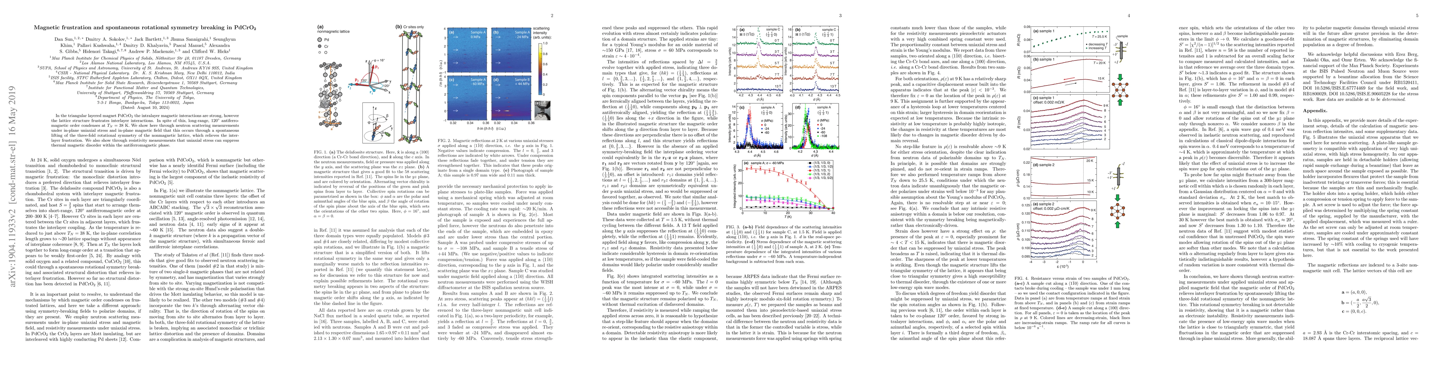 In the triangular layered magnet PdCrO2 the intralayer magnetic interactions are strong, however the lattice structure frustrates interlayer interactions. In spite of this, long-range, 120$^\circ$ antiferromagnetic order condenses at $T_N = 38$~K. We show here through neutron scattering measurements under in-plane uniaxial stress and in-plane magnetic field that this occurs through a spontaneous lifting of the three-fold rotational symmetry of the nonmagnetic lattice, which relieves the interlayer frustration. We also show through resistivity measurements that uniaxial stress can suppress thermal magnetic disorder within the antiferromagnetic phase.