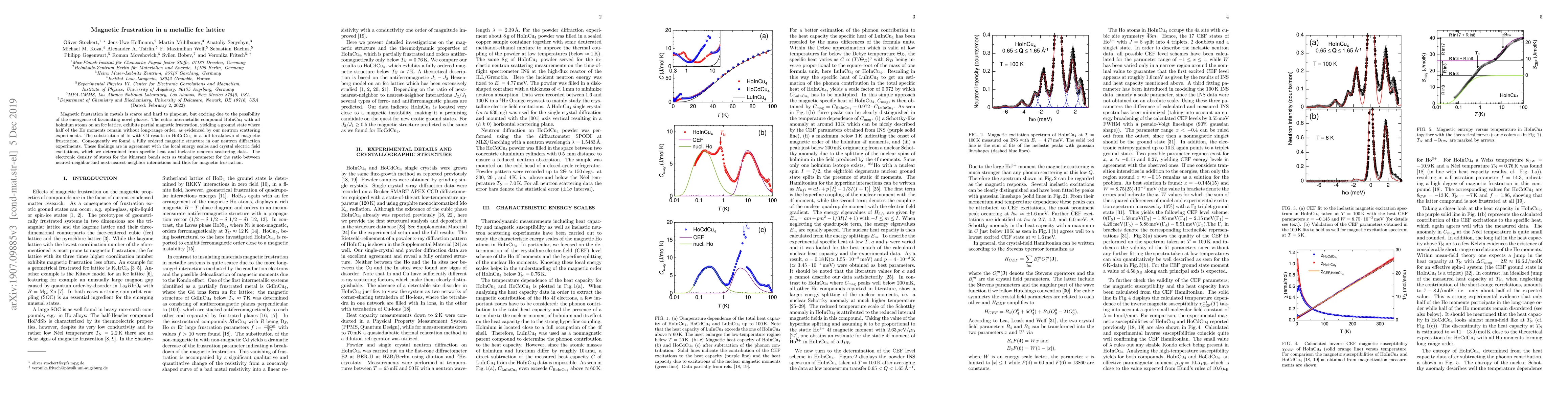 Researchers discovered magnetic frustration in a metallic fcc lattice, where half of the Ho moments remain without long-range order, but a full breakdown of frustration occurs when In is substituted with Cd, resulting in a fully ordered magnetic structure.