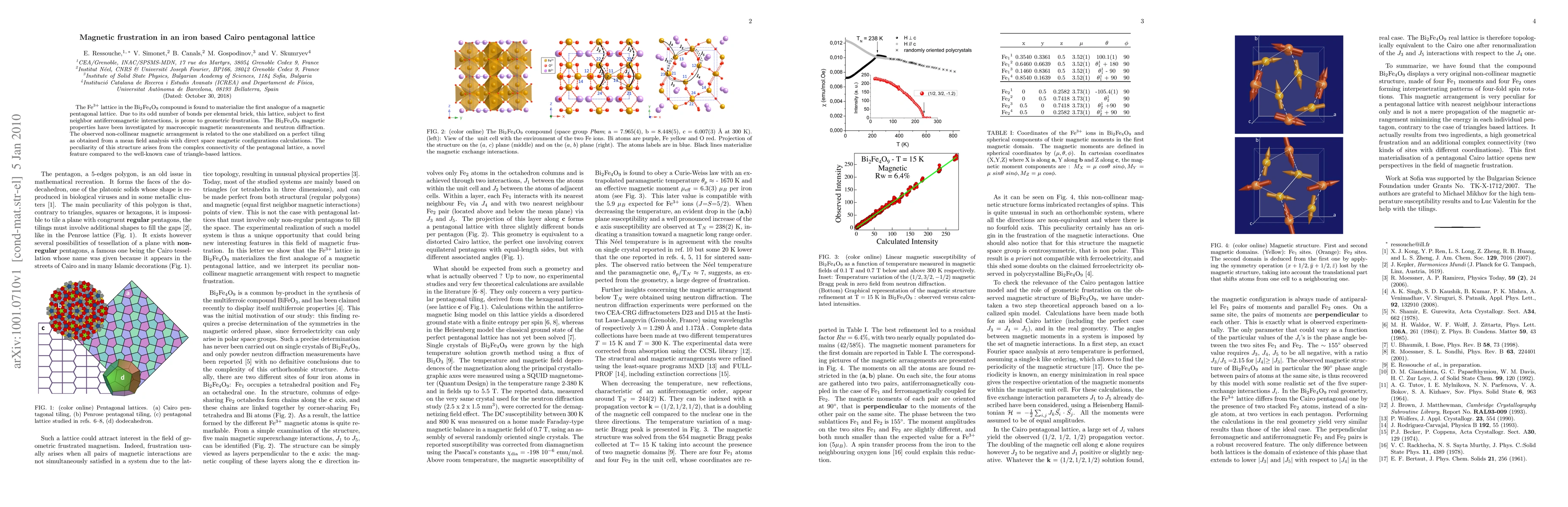 This study investigates the magnetic properties of the Bi2Fe4O9 compound, which features an iron-based Cairo pentagonal lattice prone to geometric frustration due to its unique connectivity. Macroscopic magnetic measurements and neutron diffraction reveal a non-collinear magnetic arrangement, highlighting the complex connectivity of the pentagonal lattice compared to traditional triangle-based lattices.