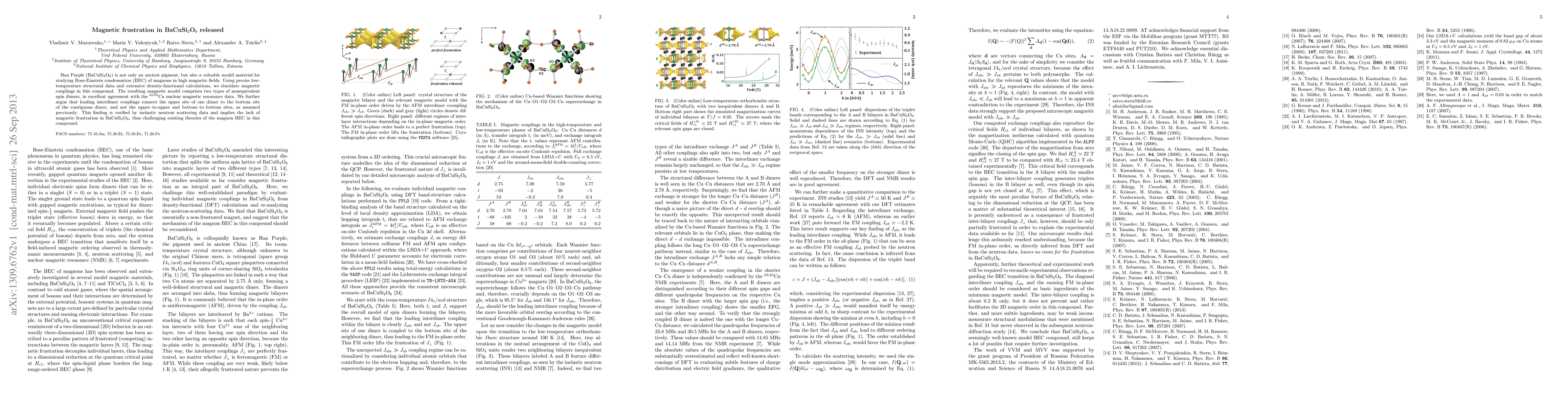 Han Purple (BaCuSi2O6) is not only an ancient pigment, but also a valuable model material for studying Bose-Einstein condensation (BEC) of magnons in high magnetic fields. Using precise low-temperature structural data and extensive density-functional calculations, we elucidate magnetic couplings in this compound. The resulting magnetic model comprises two types of nonequivalent spin dimers, in excellent agreement with the (63,65)Cu nuclear magnetic resonance data. We further argue that leading interdimer couplings connect the upper site of one dimer to the bottom site of the contiguous dimer, and not the upper-to-upper and bottom-to-bottom sites, as assumed previously. This finding is verified by inelastic neutron scattering data and implies the lack of magnetic frustration in BaCuSi2O6, thus challenging existing theories of the magnon BEC in this compound.