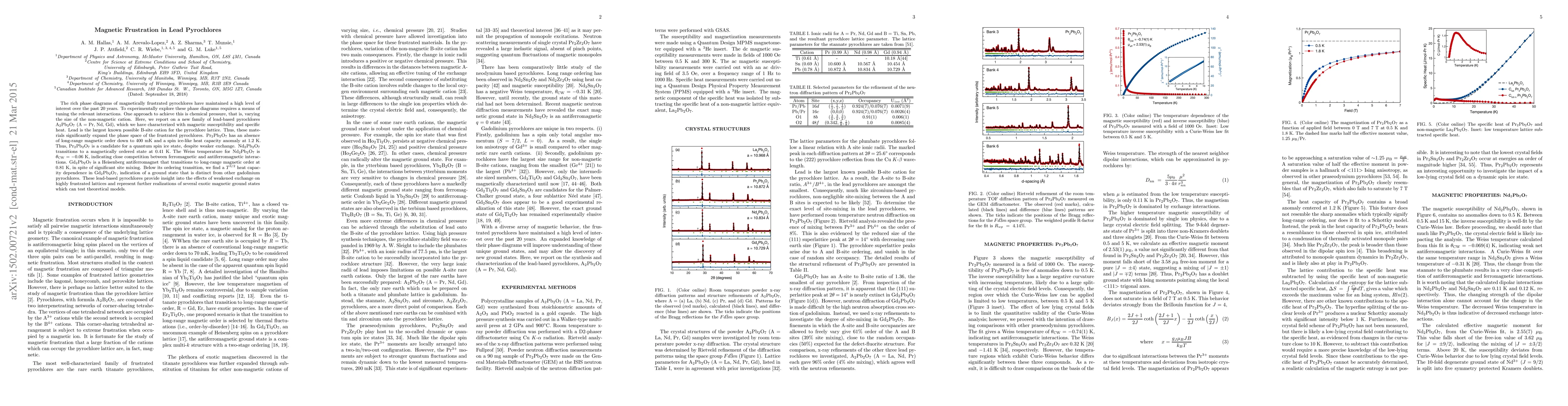 This study explores a new family of lead-based pyrochlores A$_2$Pb$_2$O$_7$ (A = Pr, Nd, Gd) to investigate magnetic frustration. Pr$_2$Pb$_2$O$_7$ shows a spin ice-like state without long-range order, while Nd$_2$Pb$_2$O$_7$ exhibits competition between ferromagnetic and antiferromagnetic interactions. Gd$_2$Pb$_2$O$_7$ transitions to a Heisenberg antiferromagnetic order, revealing distinct ground state behavior.