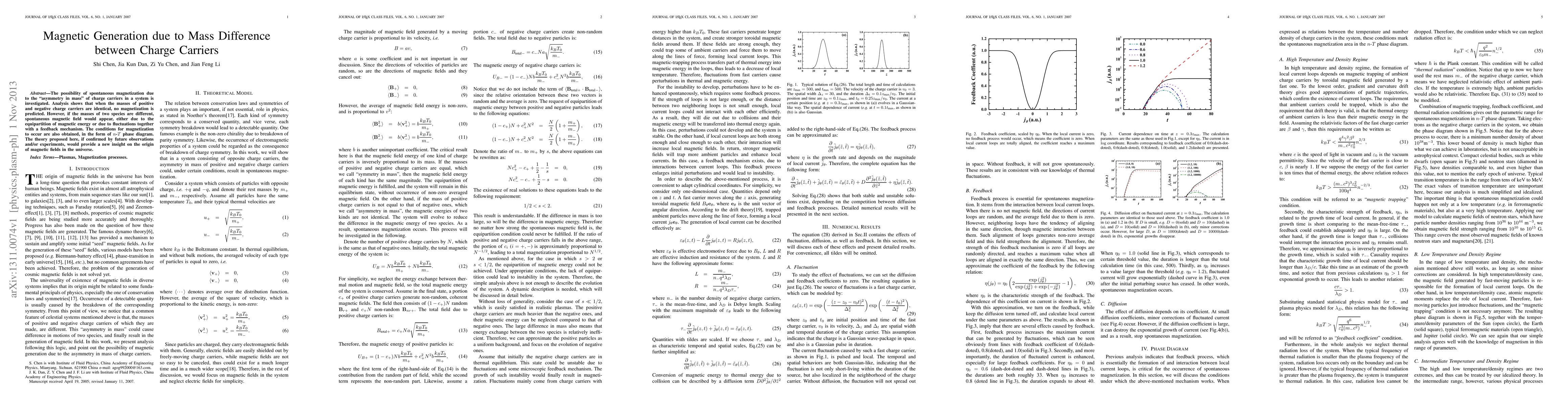 The possibility of spontaneous magnetization due to the "asymmetry in mass" of charge carriers in a system is investigated. Analysis shows that when the masses of positive and negative charge carriers are identical, no magnetization is predicted. However, if the masses of two species are different, spontaneous magnetic field would appear, either due to the equipartition of magnetic energy or due to fluctuations together with a feedback mechanism. The conditions for magnetization to occur are also obtained, in the form of n-T phase diagram. The theory proposed here, if confirmed by future observations and/or experiments, would provide a new insight on the origin of magnetic fields in the universe.