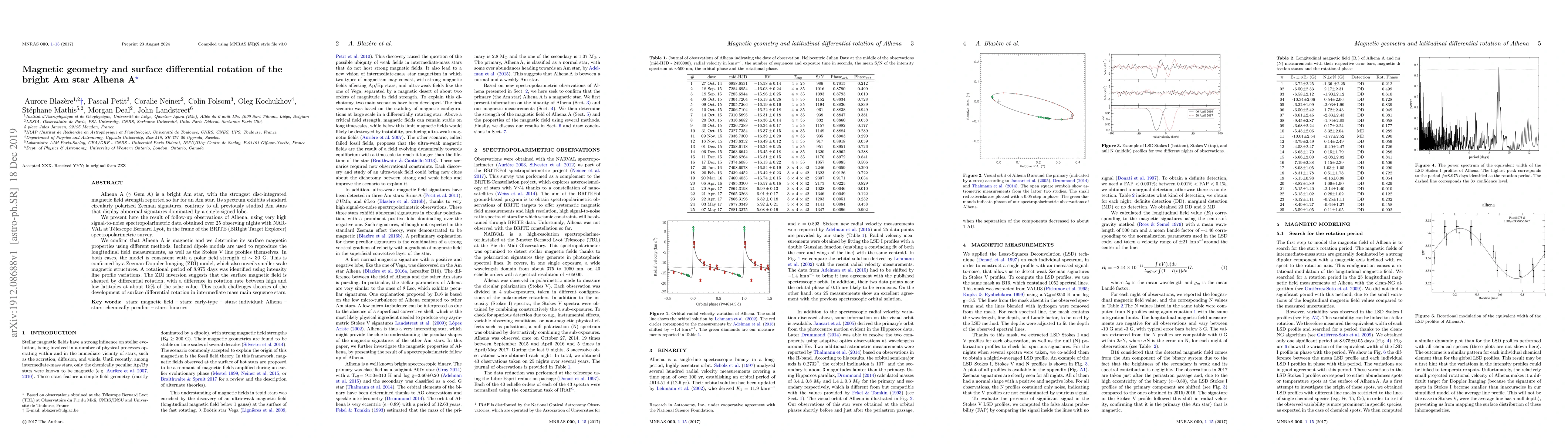 Alhena A ($\gamma$ Gem A) is a bright Am star, with the strongest disc-integrated magnetic field strength reported so far for an Am star. Its spectrum exhibits standard circularly polarized Zeeman signatures, contrary to all previously studied Am stars that display abnormal signatures dominated by a single-signed lobe. We present here the result of follow-up observations of Alhena, using very high signal-to-noise spectropolarimetric data obtained over 25 observing nights with NARVAL at T\'elescope Bernard Lyot, in the frame of the BRITE (BRIght Target Explorer) spectropolarimetric survey. We confirm that Alhena A is magnetic and we determine its surface magnetic properties using different methods. Inclined dipole models are used to reproduce the longitudinal field measurements, as well as the Stokes V line profiles themselves. In both cases, the model is consistent with a polar field strength of $\sim$ 30 G. This is confirmed by a Zeeman-Doppler Imaging (ZDI) model, which also unveils smaller scale magnetic structures. A rotational period of 8.975 days was identified using intensity line profile variations. The ZDI inversion suggests that the surface magnetic field is sheared by differential rotation, with a difference in rotation rate between high and low latitudes at about 15\% of the solar value. This result challenges theories of the development of surface differential rotation in intermediate mass main sequence stars.