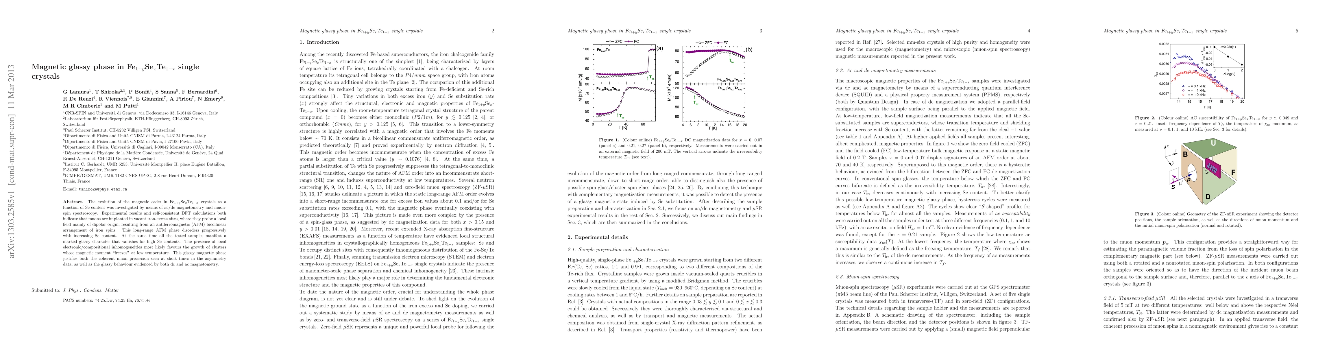 The evolution of the magnetic order in FeSeTe crystals as a function of Se content was investigated by means of ac/dc magnetometry and muon-spin spectroscopy. Experimental results and self-consistent DFT calculations both indicate that muons are implanted in vacant iron-excess sites, where they probe a local field mainly of dipolar origin, resulting from an antiferromagnetic (AFM) bicollinear arrangement of iron spins. This long-range AFM phase disorders progressively with increasing Se content. At the same time all the tested samples manifest a marked glassy character that vanishes for high Se contents. The presence of local electronic/compositional inhomogeneities most likely favours the growth of clusters whose magnetic moment "freezes" at low temperature. This glassy magnetic phase justifies both the coherent muon precession seen at short times in the asymmetry data, as well as the glassy behaviour evidenced by both dc and ac magnetometry.
