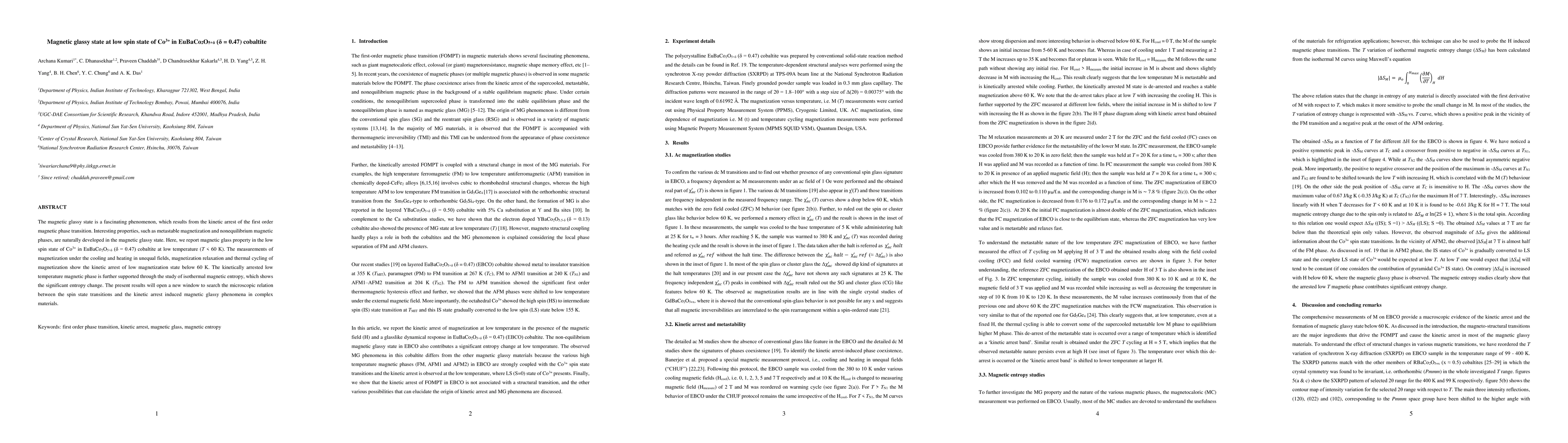 The magnetic glassy state is a fascinating phenomenon, which results from the kinetic arrest of the first order magnetic phase transition. Interesting properties, such as metastable magnetization and nonequilibrium magnetic phases, are naturally developed in the magnetic glassy state. Here, we report magnetic glass property in the low spin state of Co3+ in EuBaCo2O5+{\delta} ({\delta} = 0.47) cobaltite at low temperature (T < 60 K). The measurements of magnetization under the cooling and heating in unequal fields, magnetization relaxation and thermal cycling of magnetization show the kinetic arrest of low magnetization state below 60 K. The kinetically arrested low temperature magnetic phase is further supported through the study of isothermal magnetic entropy, which shows the significant entropy change. The present results will open a new window to search the microscopic relation between the spin state transitions and the kinetic arrest induced magnetic glassy phenomena in complex materials.