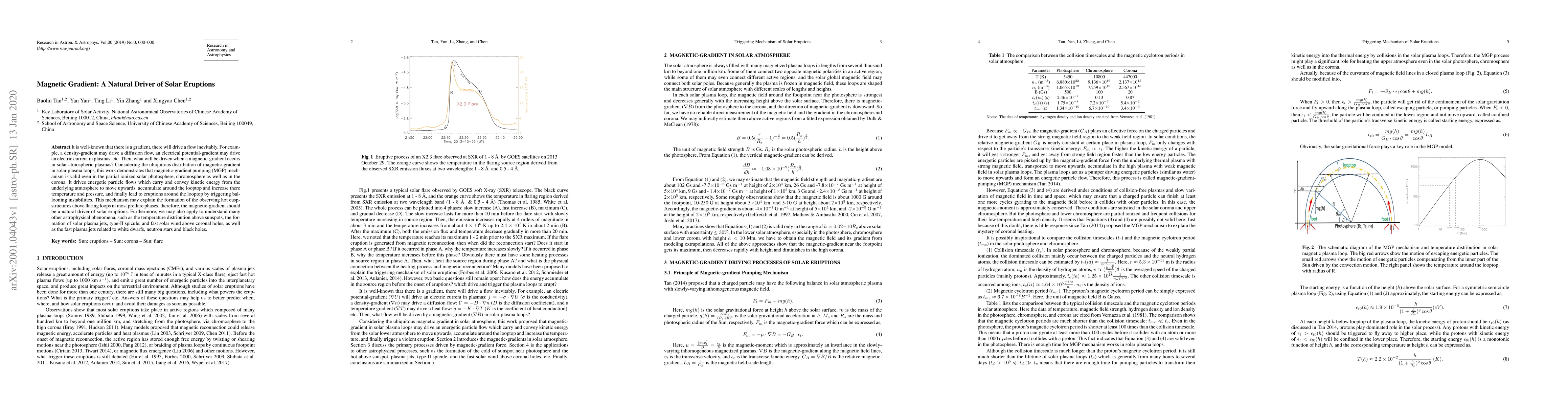 It is well-known that there is a gradient, there will drive a flow inevitably. For example, a density-gradient may drive a diffusion flow, an electrical potential-gradient may drive an electric current in plasmas, etc. Then, what will be driven when a magnetic-gradient occurs in solar atmospheric plasmas? Considering the ubiquitous distribution of magnetic-gradient in solar plasma loops, this work demonstrates that magnetic-gradient pumping (MGP) mechanism is valid even in the partial ionized solar photosphere, chromosphere as well as in the corona. It drives energetic particle flows which carry and convey kinetic energy from the underlying atmosphere to move upwards, accumulate around the looptop and increase there temperature and pressure, and finally lead to eruptions around the looptop by triggering ballooning instabilities. This mechanism may explain the formation of the observing hot cusp-structures above flaring loops in most preflare phases, therefore, the magnetic-gradient should be a natural driver of solar eruptions. Furthermore, we may also apply to understand many other astrophysical phenomena, such as the temperature distribution above sunspots, the formation of solar plasma jets, type-II spicule, and fast solar wind above coronal holes, as well as the fast plasma jets related to white dwarfs, neutron stars and black holes.