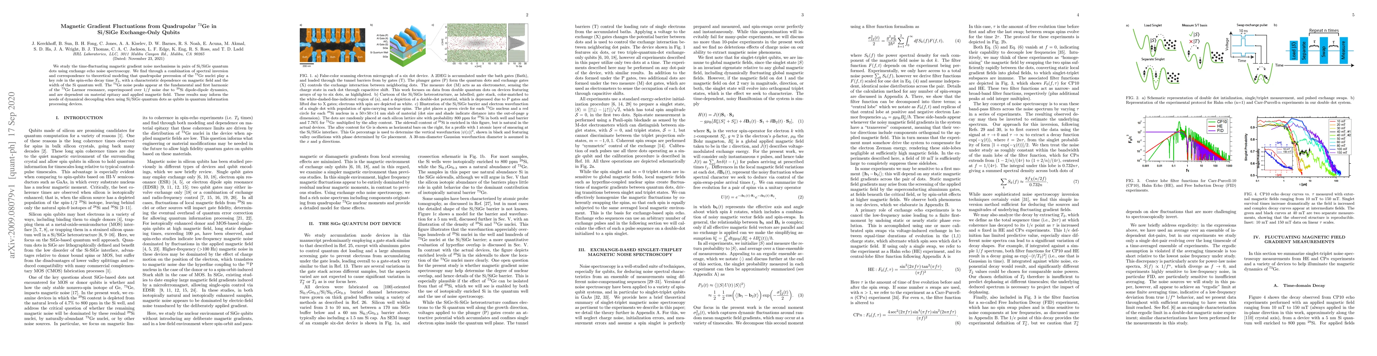 This study investigates magnetic gradient fluctuations in Si/SiGe quantum dots using exchange echo noise spectroscopy, finding that quadrupolar precession of $^{73}$Ge nuclei significantly affects spin-echo decay time $T_2$. The research identifies $1/f$ noise from $^{29}$Si dipole-dipole interactions and material-dependent noise peaks, which could guide dynamical decoupling strategies for Si/SiGe qubit applications.