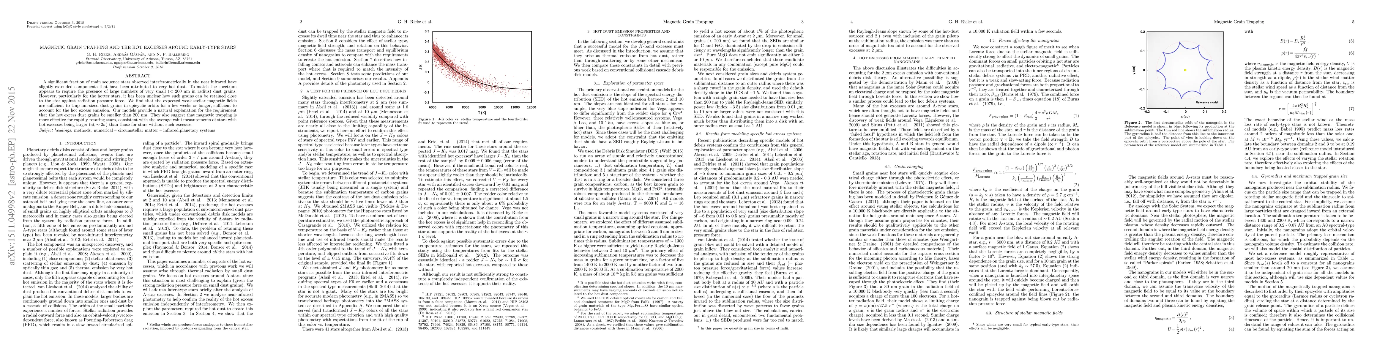 This paper proposes that weak stellar magnetic fields can trap nanometer-sized dust grains in epicyclic orbits, explaining the presence of hot excess emission around early-type stars. The model suggests that magnetic trapping is more effective for rapidly rotating stars, aligning with observations of higher rotation rates in stars exhibiting hot excesses.