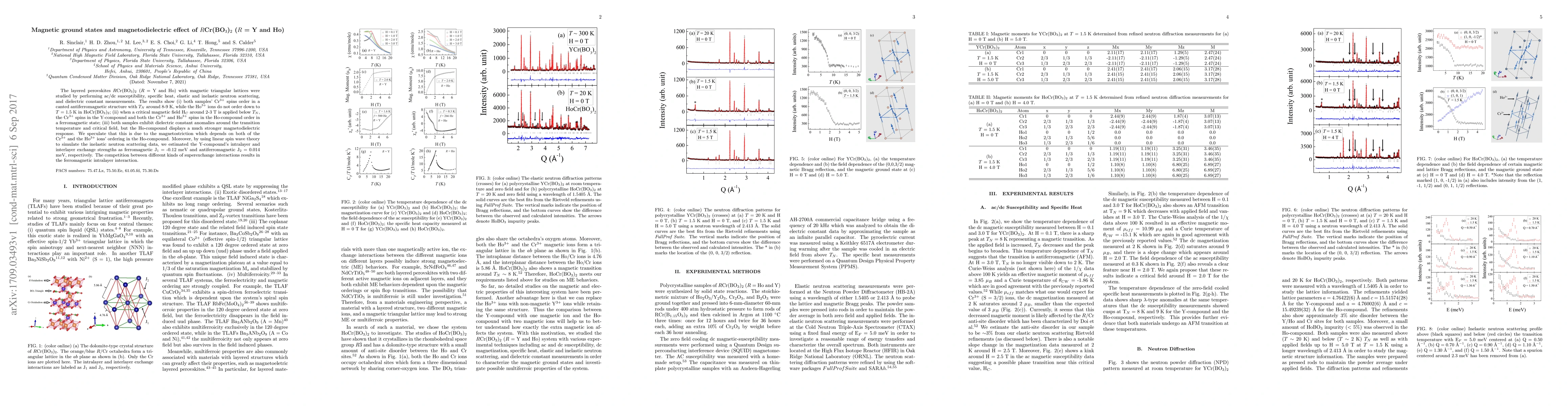 The layered perovskites $R$Cr(BO$_3$)$_2$ ($R$ = Y and Ho) with magnetic triangular lattices were studied by performing ac/dc susceptibility, specific heat, elastic and inelastic neutron scattering, and dielectric constant measurements. The results show (i) both samples' Cr$^{3+}$ spins order in a canted antiferromagnetic structure with $T_N$ around 8-9 K, while the Ho$^{3+}$ ions do not order down to $T$ = 1.5 K in HoCr(BO$_3$)$_2$; (ii) when a critical magnetic field H$_{C}$ around 2-3 T is applied below $T_{N}$, the Cr$^{3+}$ spins in the Y-compound and both the Cr$^{3+}$ and Ho$^{3+}$ spins in the Ho-compound order in a ferromagnetic state; (iii) both samples exhibit dielectric constant anomalies around the transition temperature and critical field, but the Ho-compound displays a much stronger magnetodielectric response. We speculate that this is due to the magnetostriction which depends on both of the Cr$^{3+}$ and the Ho$^{3+}$ ions' ordering in the Ho-compound. Moreover, by using linear spin wave theory to simulate the inelastic neutron scattering data, we estimated the Y-compound's intralayer and interlayer exchange strengths as ferromagnetic J$_{1}$ = -0.12 meV and antiferromagnetic J$_{2}$ = 0.014 meV, respectively. The competition between different kinds of superexchange interactions results in the ferromagnetic intralayer interaction.
