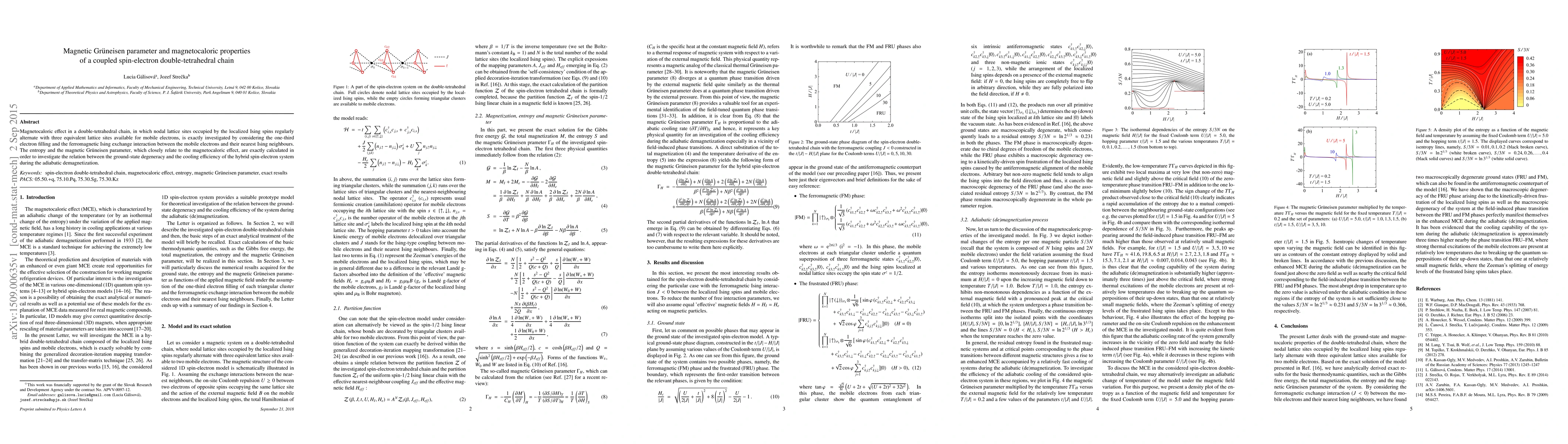 This paper investigates the magnetocaloric effect in a coupled spin-electron double-tetrahedral chain, calculating the entropy and magnetic Gruneisen parameter to explore the relationship between ground-state degeneracy and cooling efficiency during adiabatic demagnetization. The study focuses on the system's ferromagnetic interactions and one-third electron filling.