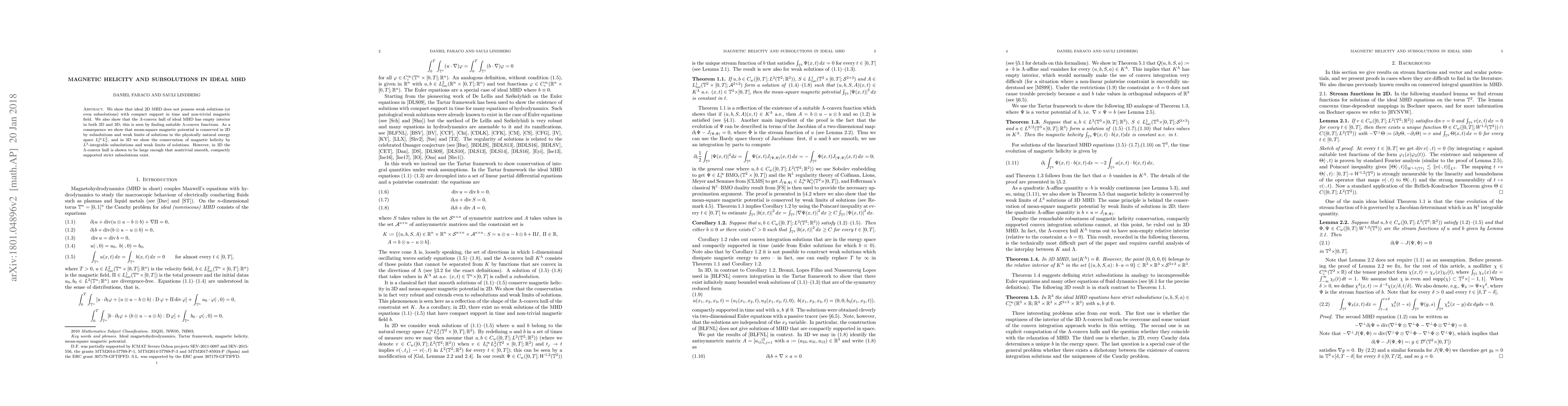 This paper demonstrates that ideal 2D magnetohydrodynamics (MHD) lacks weak solutions with compact support and non-trivial magnetic fields. It also proves that the $\Lambda$-convex hull of ideal MHD has no interior in both 2D and 3D, leading to the conservation of mean-square magnetic potential in 2D and magnetic helicity in 3D by subsolutions and weak limits.