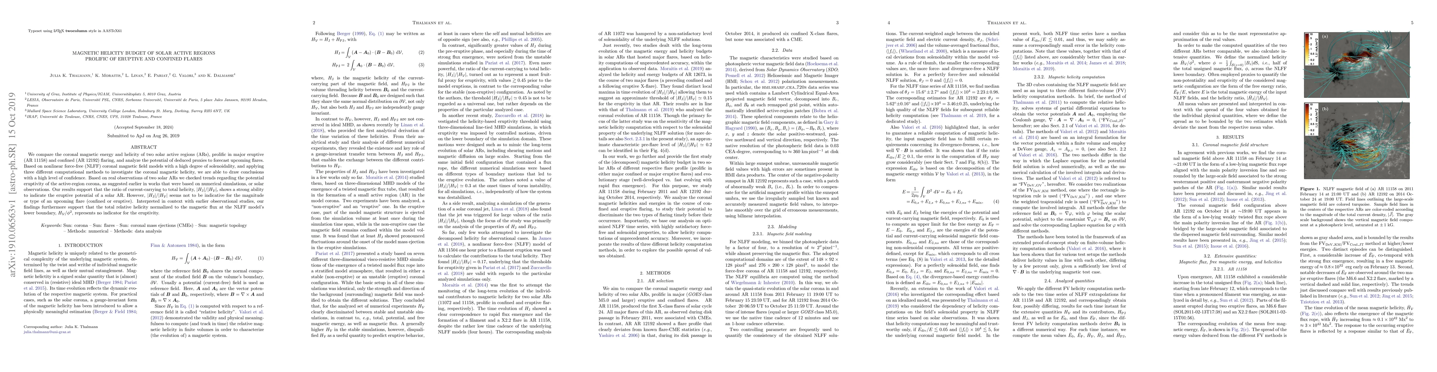 This study compares the magnetic energy and helicity of two solar active regions, AR~11158 and AR~12192, known for eruptive and confined flares, respectively. The research finds that the ratio of current-carrying to total helicity, $|H_\mathrm{J}|/|H_\mathrm{V}|$, is a strong predictor of eruptive potential but not of flare type or magnitude.