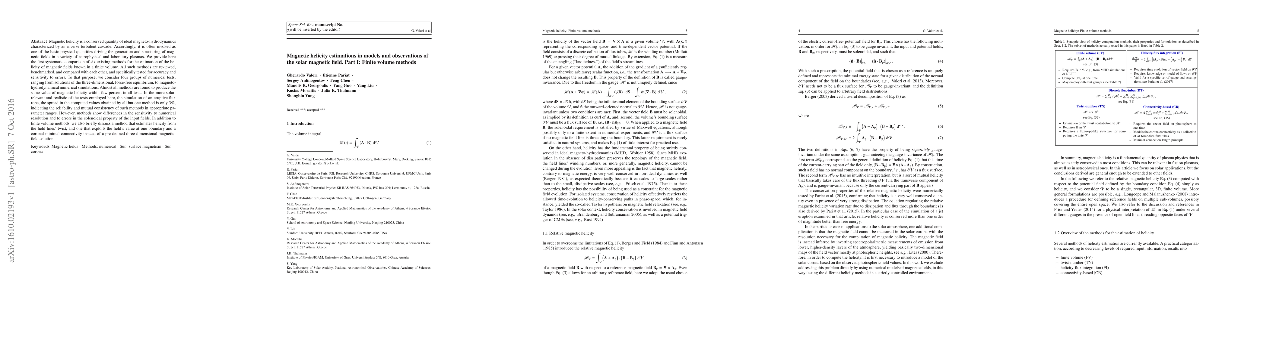 This paper systematically compares six methods for estimating magnetic helicity in finite volume models, finding that most yield consistent results within a few percent. The study highlights the reliability of these methods in solar-relevant simulations, though differences in sensitivity to numerical resolution and input field errors are noted.