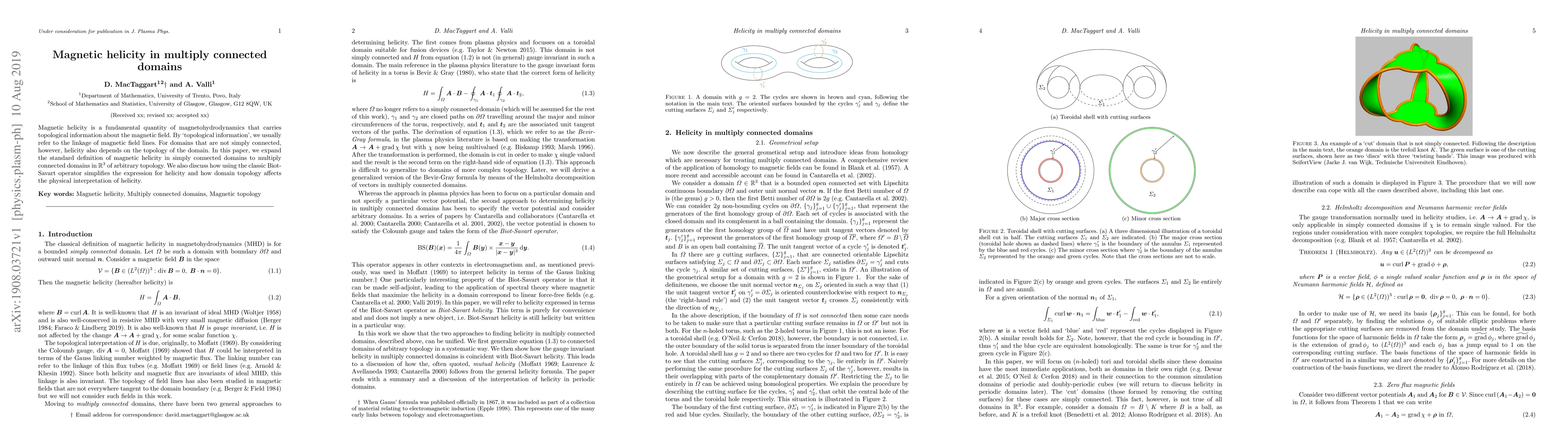 This paper extends the definition of magnetic helicity for multiply connected domains to include topological information about the domain's structure. It utilizes the Biot-Savart operator to simplify the helicity expression and explores how domain topology influences the physical interpretation of helicity.