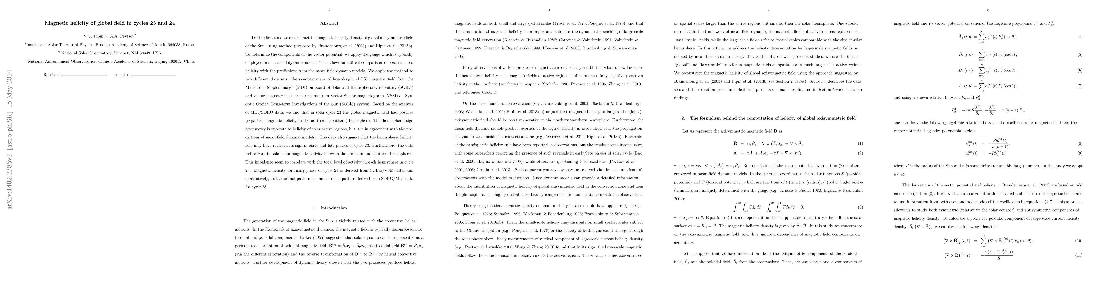Researchers reconstructed magnetic helicity density of the Sun's global field using a new method, finding hemispheric sign asymmetry opposite to active regions but in agreement with mean-field dynamo models, and an imbalance between northern and southern hemispheres.