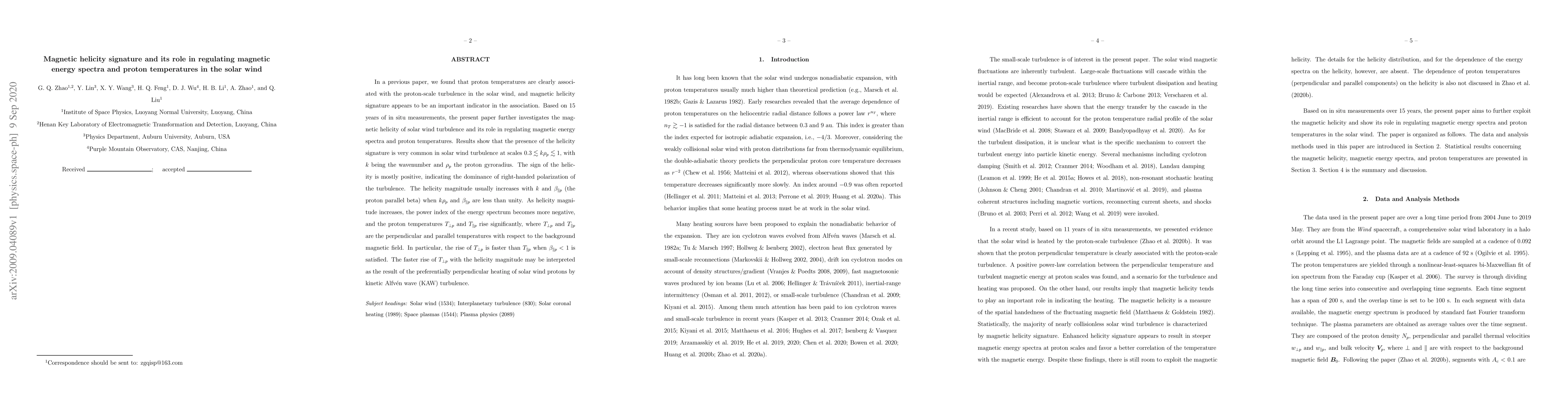 This paper investigates the magnetic helicity in solar wind turbulence, linking it to magnetic energy spectra and proton temperatures. The study shows that positive helicity dominates and correlates with increased turbulence intensity, leading to higher perpendicular proton temperatures, suggesting preferential heating by kinetic Alfvén wave turbulence.