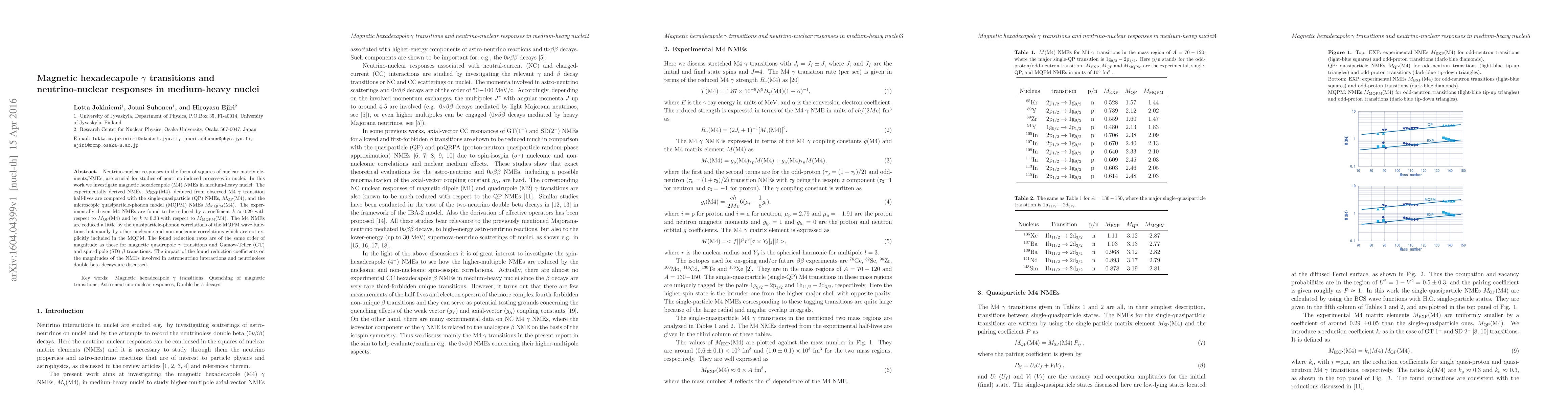 Neutrino-nuclear responses in the form of squares of nuclear matrix elements,NMEs, are crucial for studies of neutrino-induced processes in nuclei. In this work we investigate magnetic hexadecapole (M4) NMEs in medium-heavy nuclei. The experimentally derived NMEs, $M_{\rm EXP}$(M4), deduced from observed M4 $\gamma $ transition half-lives are compared with the single-quasiparticle (QP) NMEs, $M_{\rm QP}$(M4), and the microscopic quasiparticle-phonon model (MQPM) NMEs $M_{\rm MQPM}$(M4). The experimentally driven M4 NMEs are found to be reduced by a coefficient $k \approx 0.29 $ with respect to $M_{\rm QP}$(M4) and by $k \approx 0.33$ with respect to $M_{\rm MQPM}$(M4). The M4 NMEs are reduced a little by the quasiparticle-phonon correlations of the MQPM wave functions but mainly by other nucleonic and non-nucleonic correlations which are not explicitly included in the MQPM. The found reduction rates are of the same order of magnitude as those for magnetic quadrupole $\gamma $ transitions and Gamow-Teller (GT) and spin-dipole (SD) $\beta $ transitions. The impact of the found reduction coefficients on the magnitudes of the NMEs involved in astroneutrino interactions and neutrinoless double beta decays are discussed.