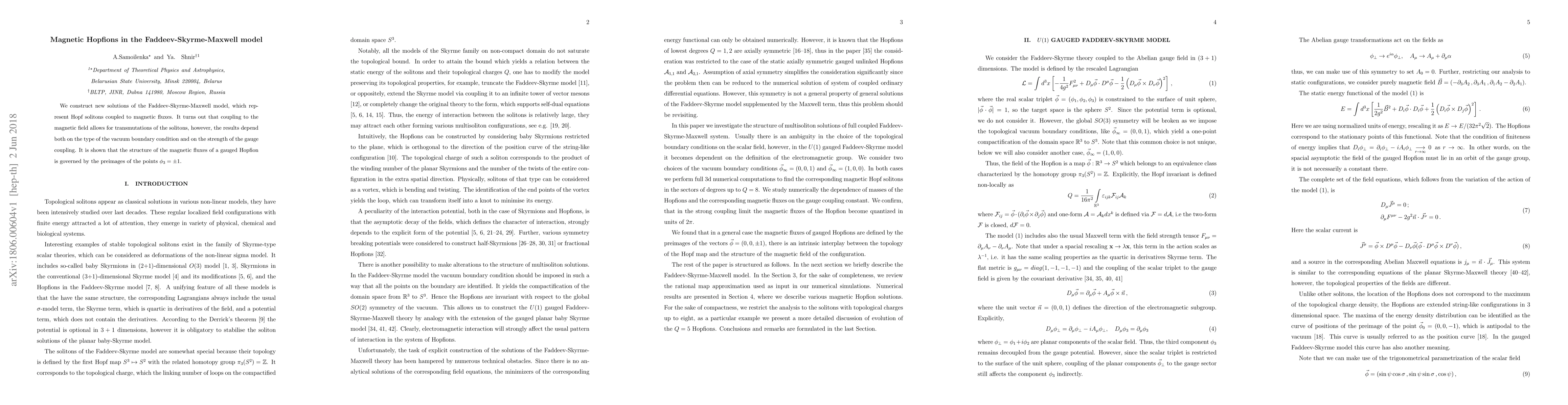 This paper introduces new solutions in the Faddeev-Skyrme-Maxwell model representing magnetic Hopf solitons, revealing that magnetic field coupling induces soliton transformations influenced by vacuum boundary conditions and gauge coupling strength. The magnetic flux structure of these gauged Hopfions is determined by the preimages of $\phi_3=\pm 1$.