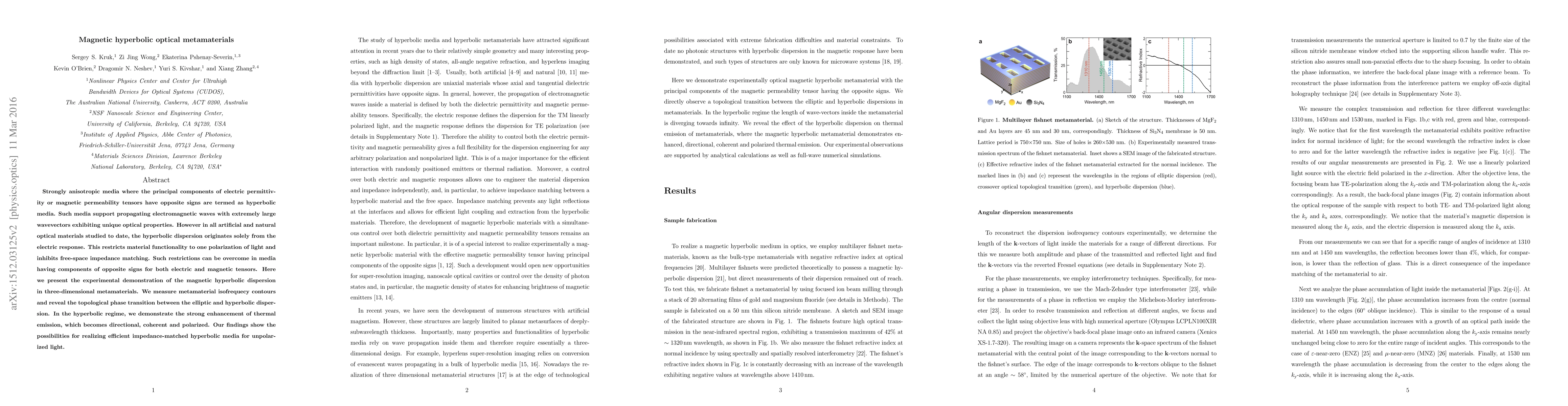 Strongly anisotropic media where the principal components of electric permittivity or magnetic permeability tensors have opposite signs are termed as hyperbolic media. Such media support propagating electromagnetic waves with extremely large wavevectors exhibiting unique optical properties. However in all artificial and natural optical materials studied to date, the hyperbolic dispersion originates solely from the electric response. This restricts material functionality to one polarization of light and inhibits free-space impedance matching. Such restrictions can be overcome in media having components of opposite signs for both electric and magnetic tensors. Here we present the experimental demonstration of the magnetic hyperbolic dispersion in three-dimensional metamaterials. We measure metamaterial isofrequecy contours and reveal the topological phase transition between the elliptic and hyperbolic dispersion. In the hyperbolic regime, we demonstrate the strong enhancement of thermal emission, which becomes directional, coherent and polarized. Our findings show the possibilities for realizing efficient impedance-matched hyperbolic media for unpolarized light.
