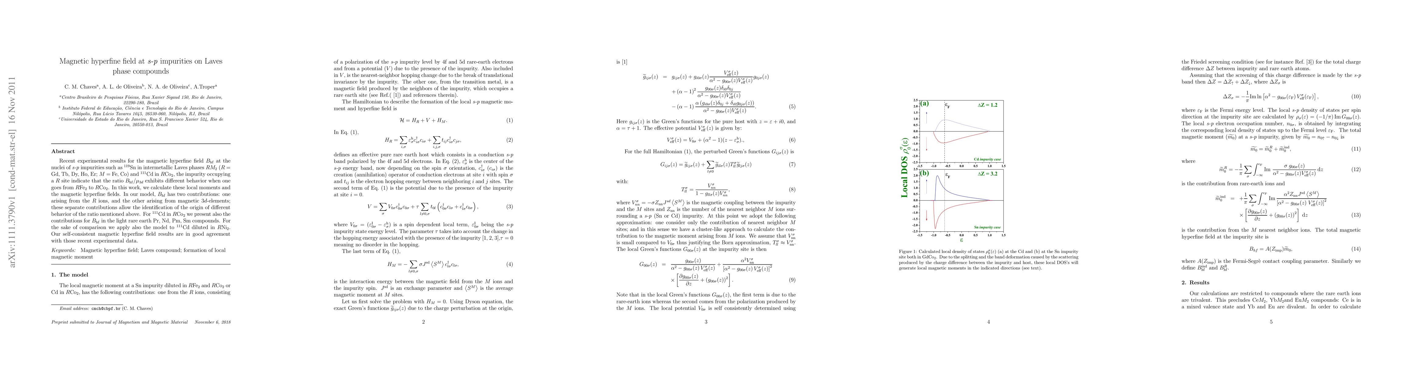 Recent experimental results for the magnetic hyperfine field B_{\rm hf} at the nuclei of \textit{s-p} impurities such as ${}^{119}$Sn in intermetallic Laves phases RM_2 (R = Gd, Tb, Dy, Ho, Er; M = Fe, Co) and ${}^{111}$Cd in RCo_{2}, the impurity occupying a $R$ site indicate that the ratio B_{\rm hf}/\mu_{3d} exhibits different behavior when one goes from RFe_2 to RCo_2. In this work, we calculate these local moments and the magnetic hyperfine fields. In our model, B_{\rm hf} has two contributions: one arising from the $R$ ions, and the other arising from magnetic 3d-elements; these separate contributions allow the identification of the origin of different behavior of the ratio mentioned above. For {}^{111}Cd in RCo_2 we present also the contributions for B_{\rm hf} in the light rare earth Pr, Nd, Pm, Sm compounds. For the sake of comparison we apply also the model to {}^{111}Cd diluted in RNi_2. Our self-consistent magnetic hyperfine field results are in good agreement with those recent experimental data.