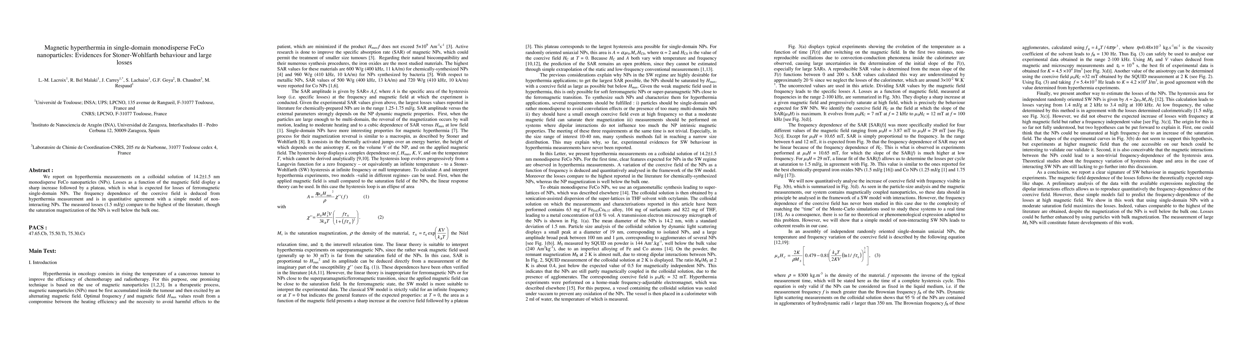 This study investigates magnetic hyperthermia in 15 nm monodisperse FeCo nanoparticles, revealing Stoner-Wohlfarth behavior and large losses, with a peak loss value of 1.5 mJ/g, comparable to the highest reported in literature despite lower saturation magnetization. The frequency dependence of the coercive field aligns with a model of non-interacting nanoparticles.