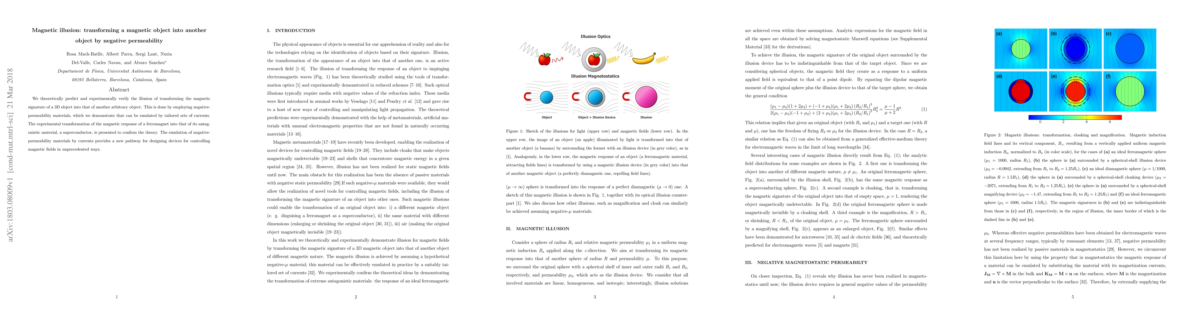 This paper theoretically predicts and experimentally verifies the transformation of a magnetic object's signature into another using negative-permeability materials emulated by tailored currents. The study demonstrates the magnetic response change of a ferromagnet to a superconductor, offering new methods for magnetic field control.