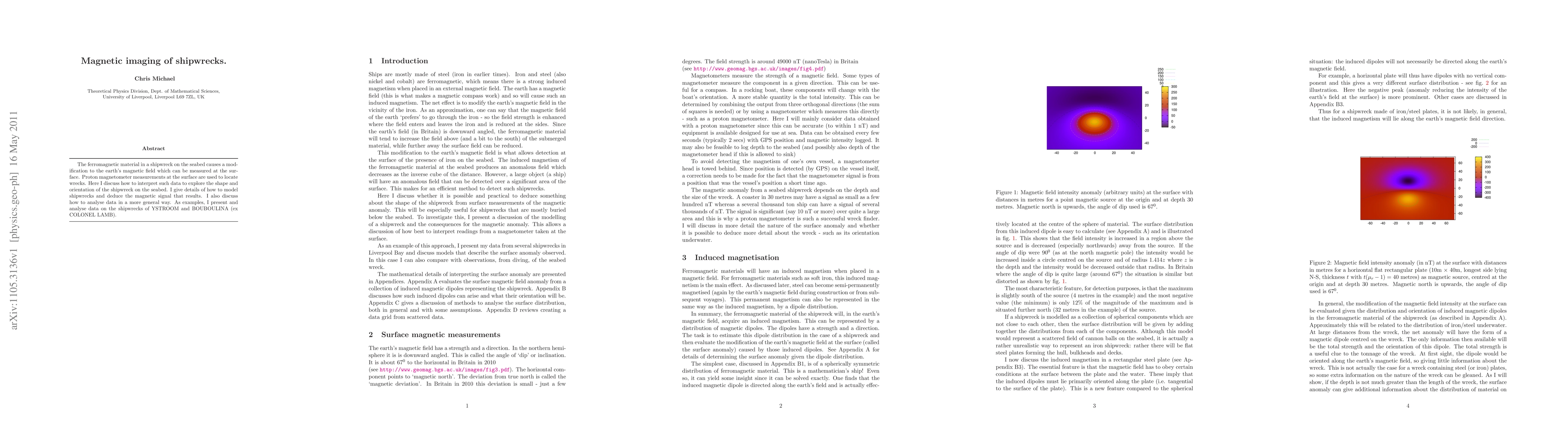 The ferromagnetic material in a shipwreck on the seabed causes a modification to the earth's magnetic field which can be measured at the surface. Proton magnetometer measurements at the surface are used to locate wrecks. Here I discuss how to interpret such data to explore the shape and orientation of the shipwreck on the seabed. I give details of how to model shipwrecks and deduce the magnetic signal that results. I also discuss how to analyse data in a more general way. As examples, I present and analyse data on the shipwrecks of YSTROOM and BOUBOULINA (ex COLONEL LAMB).