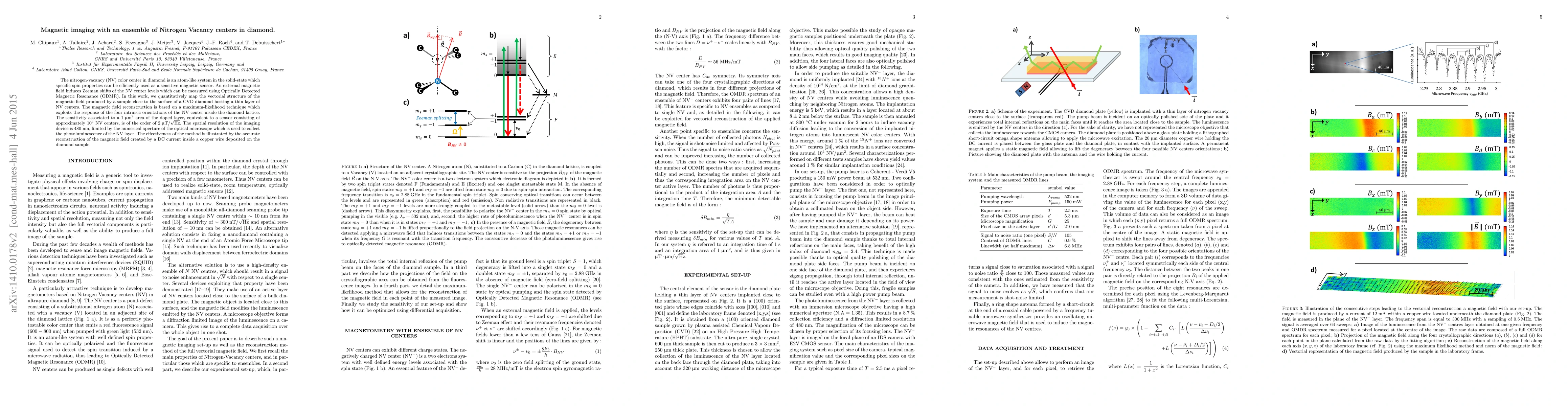 This paper presents a magnetic imaging technique using an ensemble of Nitrogen Vacancy (NV) centers in diamond, leveraging Optically Detected Magnetic Resonance (ODMR) to map the vectorial structure of magnetic fields. The method achieves a sensitivity of 2 μT/√Hz and a spatial resolution of 400 nm, demonstrated through the reconstruction of magnetic fields from a DC current in a copper wire.