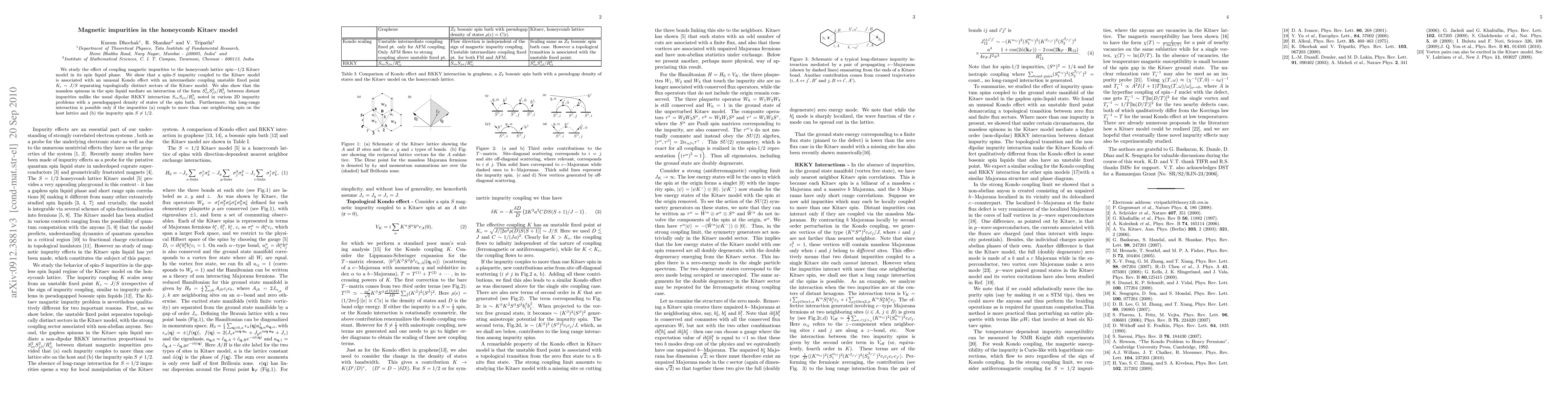 We study the effect of coupling magnetic impurities to the honeycomb lattice spin-1/2 Kitaev model in its spin liquid phase. We show that a spin-S impurity coupled to the Kitaev model is associated with an unusual Kondo effect with an intermediate coupling unstable fixed point K_c J/S separating topologically distinct sectors of the Kitaev model. We also show that the massless spinons in the spin liquid mediate an interaction of the form S_{i\alpha}^{2}S_{j\beta}^{2}/R_{ij}^{3} between distant impurities unlike the usual dipolar RKKY interaction S_{i\alpha}S_{j\alpha}/R_{ij}^{3} noted in various 2D impurity problems with a pseudogapped density of states of the spin bath. Furthermore, this long-range interaction is possible only if the impurities (a) couple to more than one neighboring spin on the host lattice and (b) the impurity spin is not a spin-1/2.$