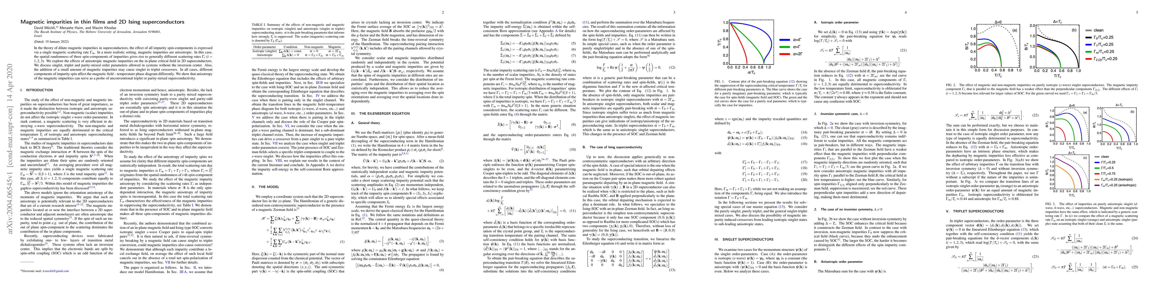 This paper investigates the impact of anisotropic magnetic impurities on the in-plane critical field in 2D superconductors, revealing that different spin components lead to distinct scattering rates. It demonstrates that such impurities can induce transitions between singlet and triplet order parameters, serving as a probe for identifying unconventional superconductivity.