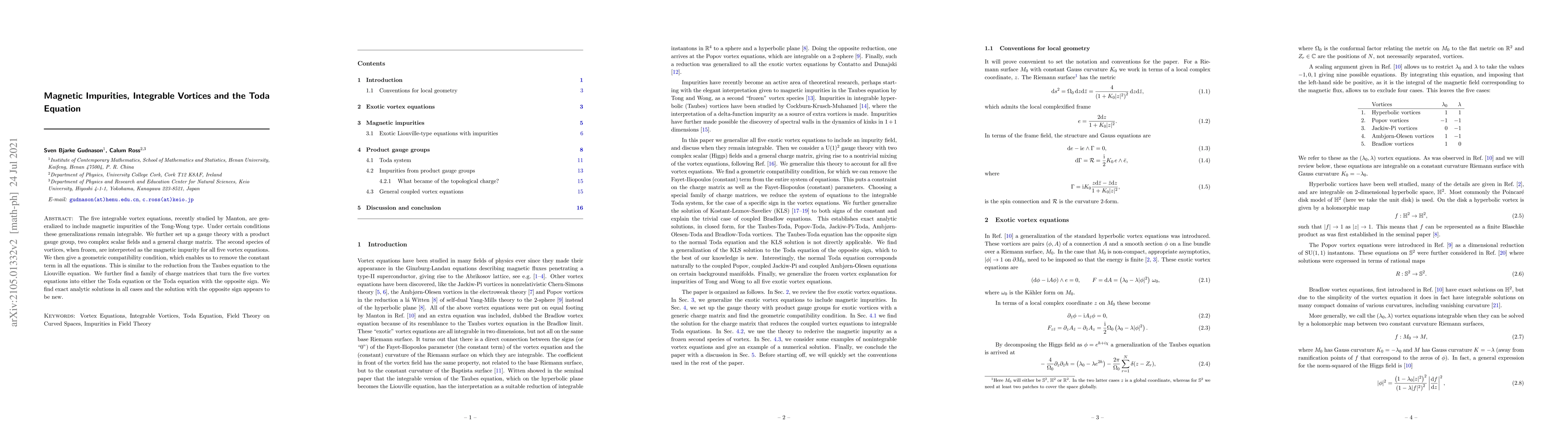 The five integrable vortex equations, recently studied by Manton, are generalized to include magnetic impurities of the Tong-Wong type. Under certain conditions these generalizations remain integrable. We further set up a gauge theory with a product gauge group, two complex scalar fields and a general charge matrix. The second species of vortices, when frozen, are interpreted as the magnetic impurity for all five vortex equations. We then give a geometric compatibility condition, which enables us to remove the constant term in all the equations. This is similar to the reduction from the Taubes equation to the Liouville equation. We further find a family of charge matrices that turn the five vortex equations into either the Toda equation or the Toda equation with the opposite sign. We find exact analytic solutions in all cases and the solution with the opposite sign appears to be new.