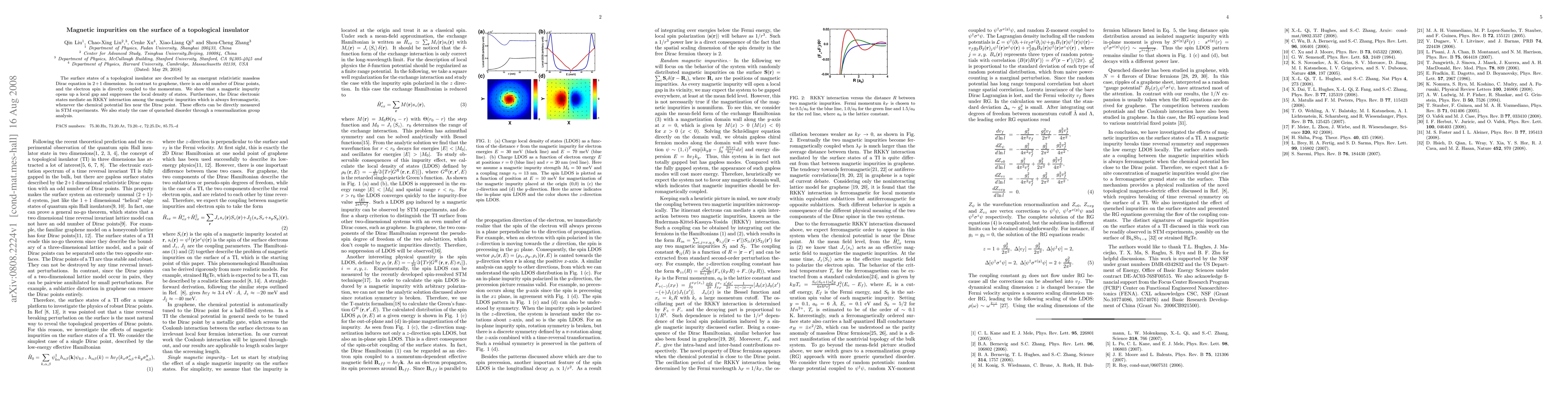 This paper investigates how magnetic impurities on the surface of a topological insulator affect its electronic states, revealing that they open local gaps and mediate a ferromagnetic RKKY interaction, detectable via STM experiments. Renormalization group analysis also explores the impact of quenched disorder.