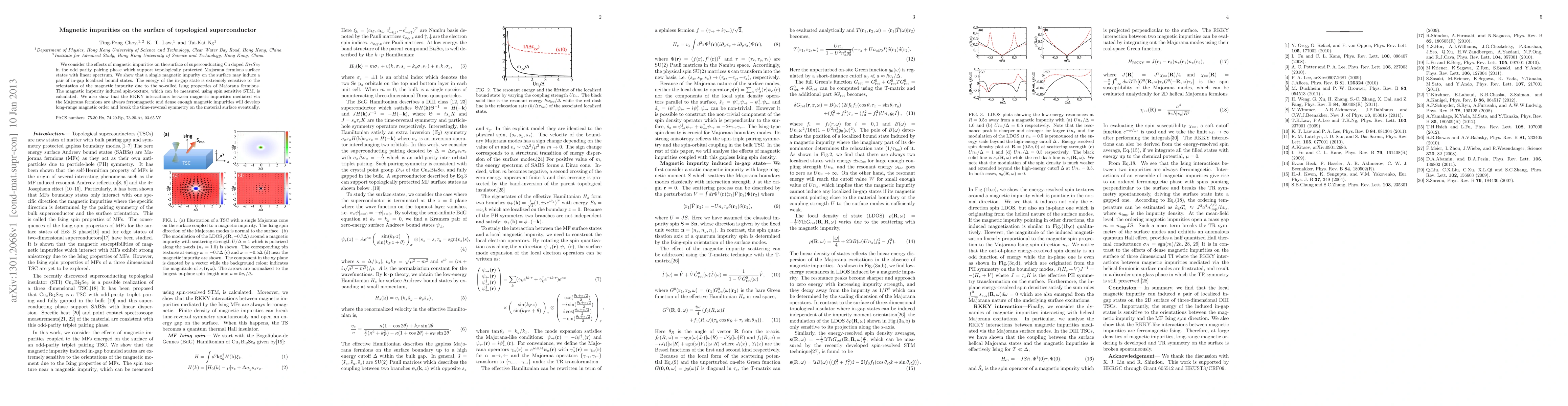 We consider the effects of magnetic impurities on the surface of superconducting Cu doped $Bi_{2}Se_{3}$ in the odd parity pairing phase which support topologically protected Majorana fermions surface states with linear spectrum. We show that a single magnetic impurity on the surface may induce a pair of in-gap localized bound states. The energy of the in-gap state is extremely sensitive to the orientation of the magnetic impurity due to the so-called Ising properties of Majorana fermions. The magnetic impurity induced spin-texture, which can be measured using spin sensitive STM, is calculated. We also show that the RKKY interactions between magnetic impurities mediated via the Majorana fermions are always ferromagnetic and dense enough magnetic impurities will develop long-range magnetic order and break the time-reversal symmetry on the material surface eventually.
