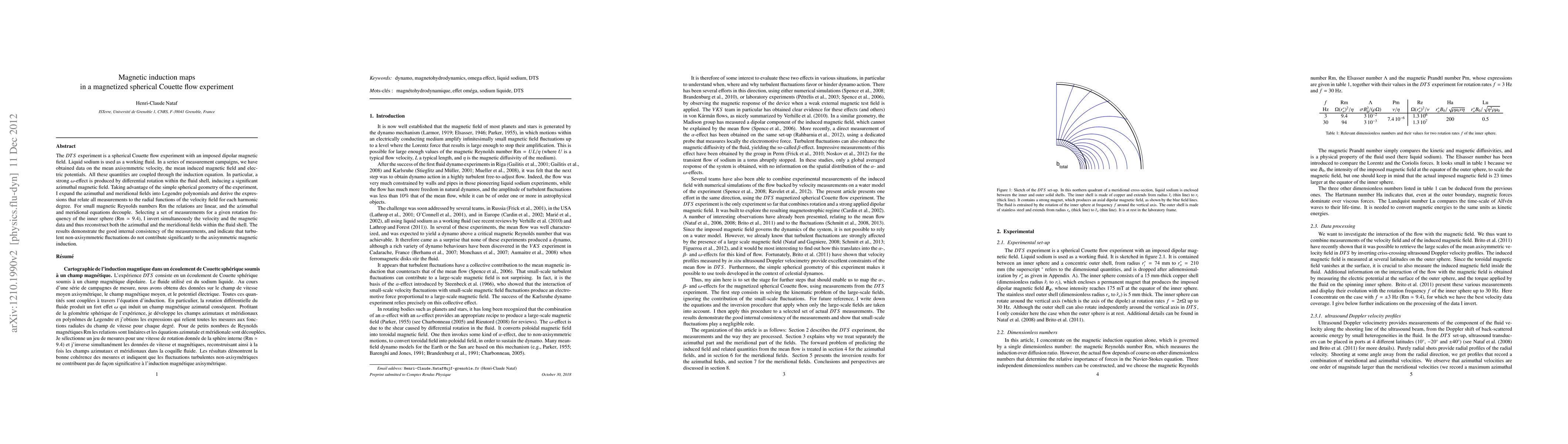 The DTS experiment is a spherical Couette flow experiment with an imposed dipolar magnetic field. Liquid sodium is used as a working fluid. In a series of measurement campaigns, we have obtained data on the mean axisymmetric velocity, the mean induced magnetic field and electric potentials. All these quantities are coupled through the induction equation. In particular, a strong omega-eff ect is produced by di fferential rotation within the fluid shell, inducing a significant azimuthal magnetic field. Taking advantage of the simple spherical geometry of the experiment, I expand the azimuthal and meridional fields into Legendre polynomials and derive the expressions that relate all measurements to the radial functions of the velocity field for each harmonic degree. For small magnetic Reynolds numbers Rm the relations are linear, and the azimuthal and meridional equations decouple. Selecting a set of measurements for a given rotation frequency of the inner sphere (Rm = 9.4), I invert simultaneously the velocity and the magnetic data and thus reconstruct both the azimuthal and the meridional fields within the fluid shell. The results demonstrate the good internal consistency of the measurements, and indicate that turbulent non-axisymmetric fluctuations do not contribute significantly to the axisymmetric magnetic induction.
