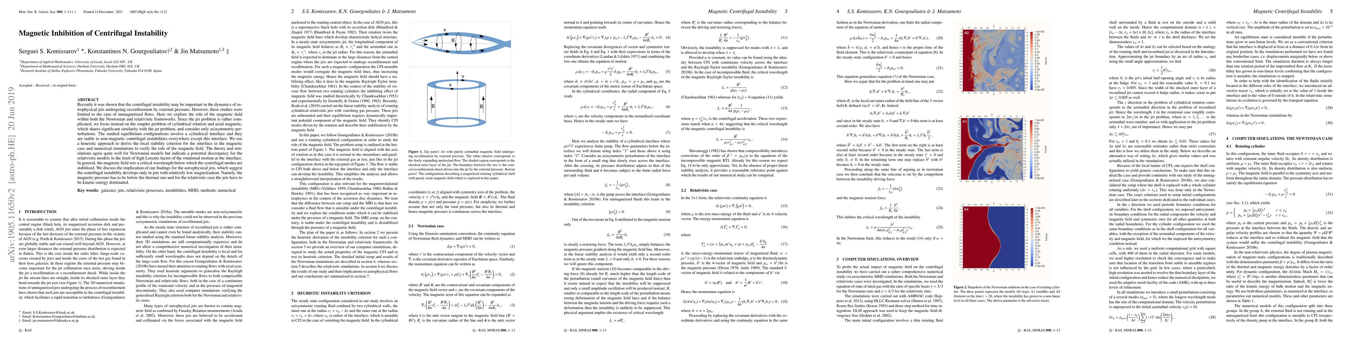 This paper investigates how magnetic fields inhibit centrifugal instability in astrophysical jets, using a simplified cylindrical rotation model with an axial magnetic field. The study finds that magnetic fields stabilize centrifugal modes below a critical wavelength, suggesting that centrifugal instability is less likely in highly magnetized jets.