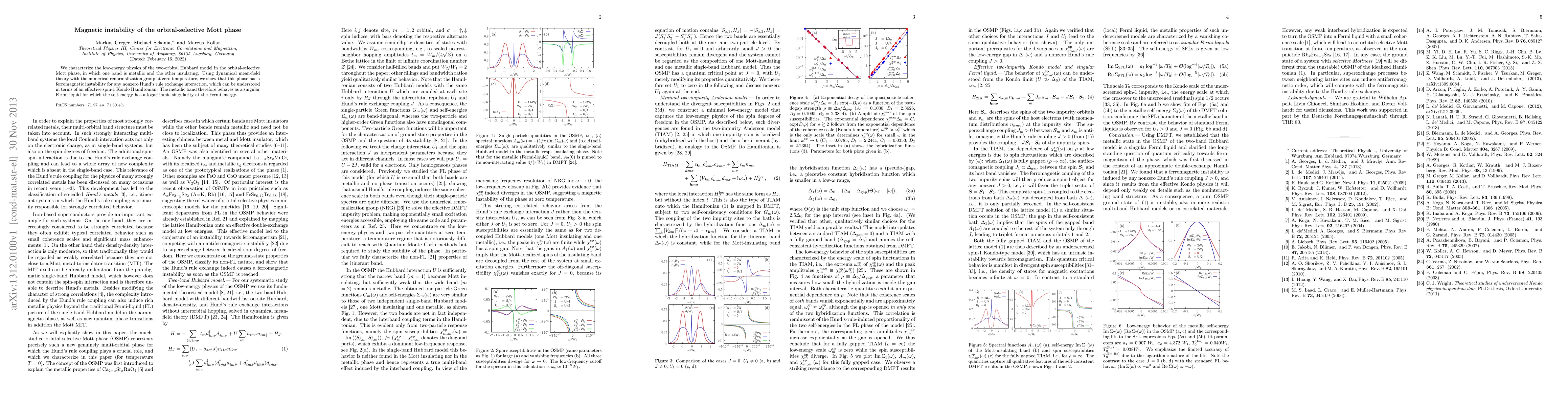 This paper investigates the low-energy dynamics of the orbital-selective Mott phase in the two-orbital Hubbard model, revealing a ferromagnetic instability driven by Hund's rule interactions. The metallic band exhibits singular Fermi liquid behavior with a logarithmic singularity in its self-energy.