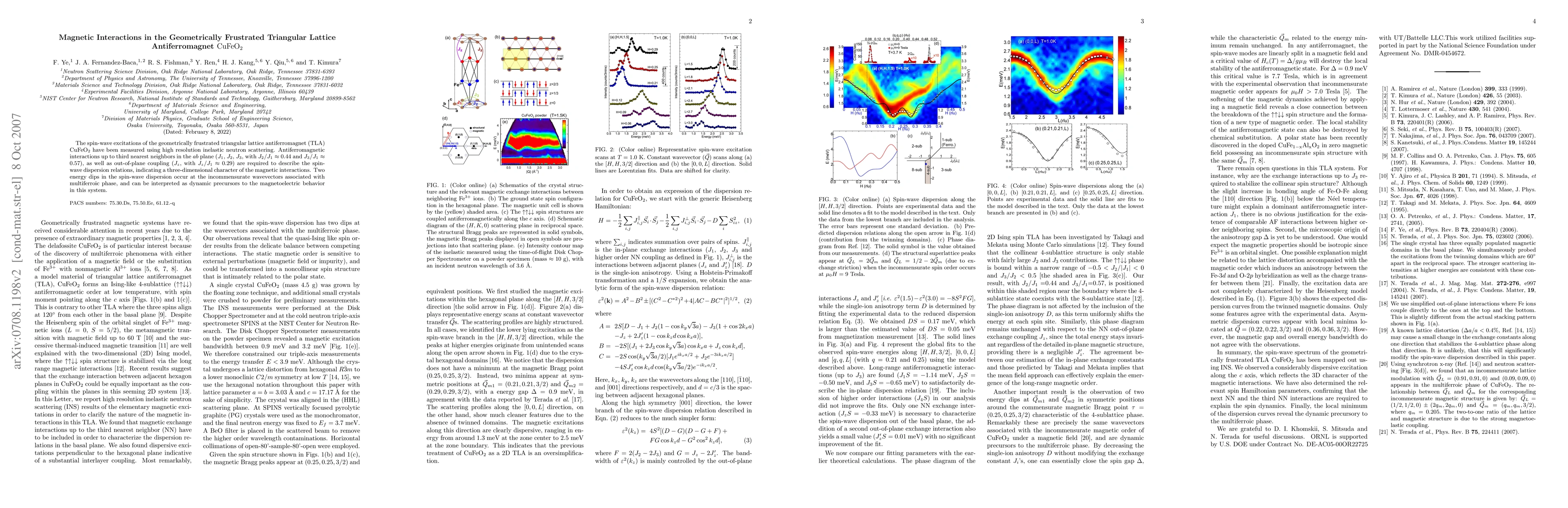 The spin wave excitations of the geometrically frustrated triangular lattice antiferromagnet (TLA) $\rm CuFeO_2$ have been measured using high resolution inelastic neutron scattering. Antiferromagnetic interactions up to third nearest neighbors in the ab plane (J_1, J_2, J_3, with $J_2/J_1 \approx 0.44$ and $J_3/J_1 \approx 0.57$), as well as out-of-plane coupling (J_z, with $J_z/J_1 \approx 0.29$) are required to describe the spin wave dispersion relations, indicating a three dimensional character of the magnetic interactions. Two energy dips in the spin wave dispersion occur at the incommensurate wavevectors associated with multiferroic phase, and can be interpreted as dynamic precursors to the magnetoelectric behavior in this system.