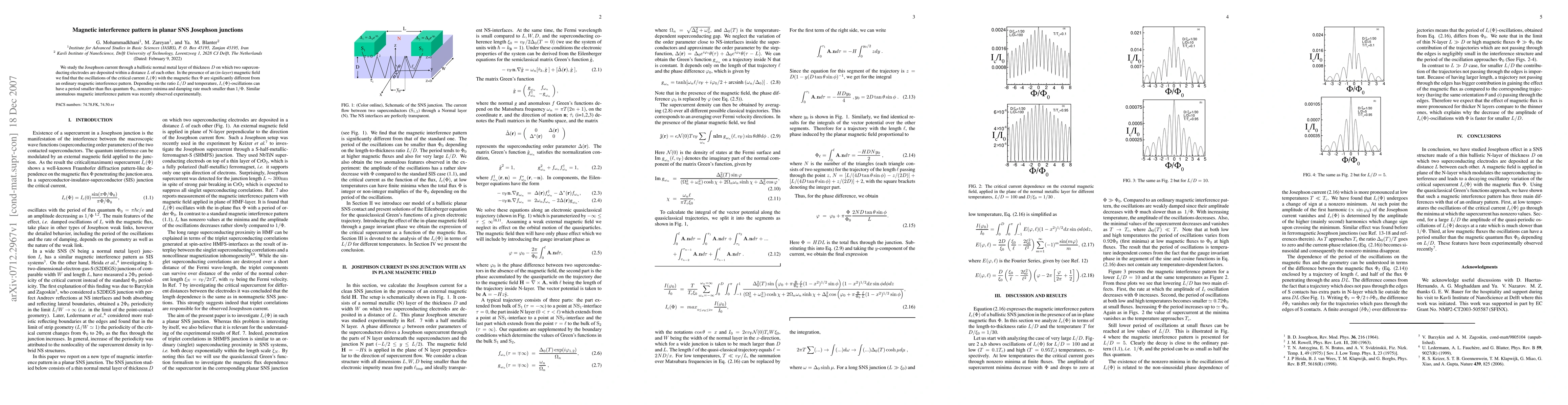 We study the Josephson current through a ballistic normal metal layer of thickness $D$ on which two superconducting electrodes are deposited within a distance $L$ of each other. In the presence of an ({\it in-layer}) magnetic field we find that the oscillations of the critical current $I_c(\Phi)$ with the magnetic flux $\Phi$ are significantly different from an ordinary magnetic interference pattern. Depending on the ratio $L/D$ and temperature, $I_c(\Phi)$-oscillations can have a period smaller than flux quantum $\Phi_0$, nonzero minima and damping rate much smaller than $1/\Phi$. Similar anomalous magnetic interference pattern was recently observed experimentally.