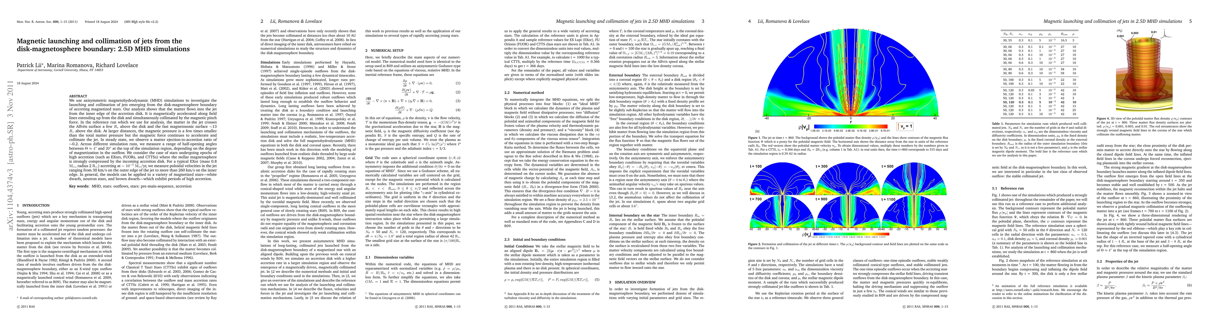 This paper uses 2.5D MHD simulations to explore jet launching and collimation from the disk-magnetosphere boundary of accreting magnetized stars. The simulations reveal that jets are magnetically accelerated and collimated by the magnetic pinch force, with a steady-state ejection-to-accretion ratio of ~0.2 and varying half-opening angles between 4° and 20°.