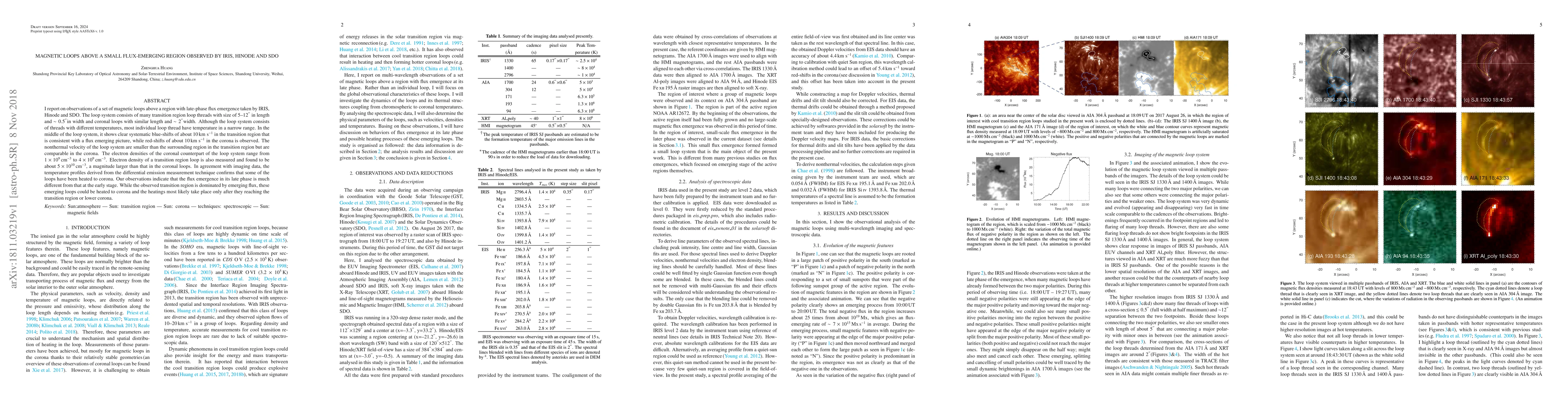 I report on observations of a set of magnetic loops above a region with late-phase flux emergence taken by IRIS, Hinode and SDO. The loop system consists of many transition region loop threads with size of 5--12\arcsec\ in length and $\sim0.5$\arcsec in width and coronal loops with similar length and $\sim2$\arcsec width. Although the loop system consists of threads with different temperatures, most individual loop thread have temperature in a narrow range. In the middle of the loop system, it shows clear systematic blue-shifts of about 10\,\kms\ in the transition region that is consistent with a flux emerging picture, while red-shifts of about 10\,\kms\ in the corona is observed. The nonthermal velocity of the loop system are smaller than the surrounding region in the transition region but are comparable in the corona. The electron densities of the coronal counterpart of the loop system range from $1\times10^9$\,cm$^{-3}$ to $4\times10^9$\,cm$^{-3}$. Electron density of a transition region loop is also measured and found to be about $5\times10^{10}$\,cm$^{-3}$, a magnitude larger than that in the coronal loops. In agreement with imaging data, the temperature profiles derived from the differential emission measurement technique confirms that some of the loops have been heated to corona. Our observations indicate that the flux emergence in its late phase is much different from that at the early stage. While the observed transition region is dominated by emerging flux, these emerging loops could be heated to corona and the heatings (if via nonthermal processes) most likely take place only after they reaching the transition region or lower corona.
