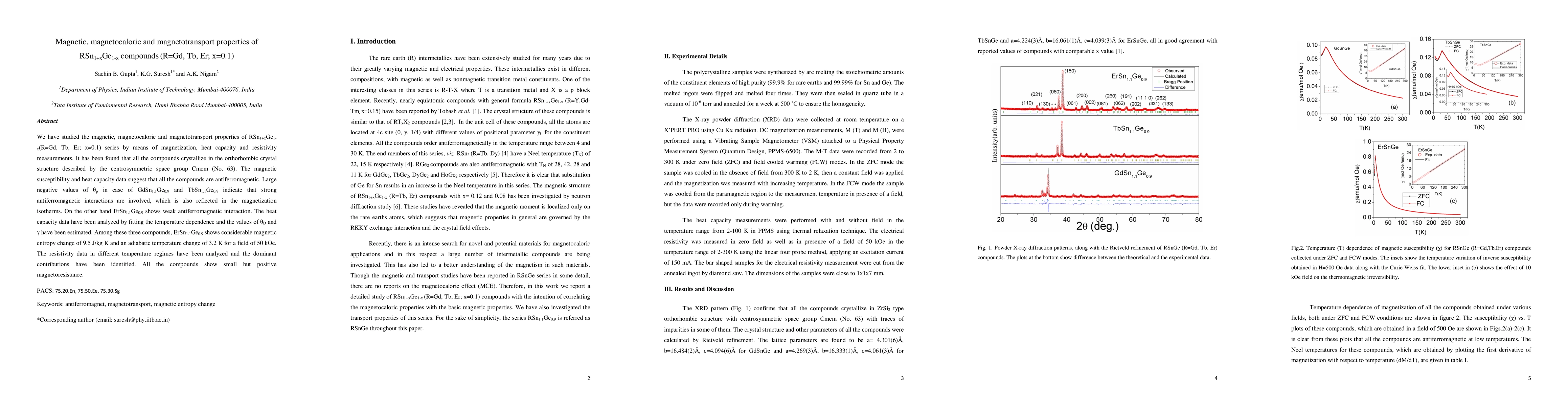 We have studied the magnetic, magnetocaloric and magnetotransport properties of RSn1+xGe1-x(R=Gd, Tb, Er; x=0.1) series by means of magnetization, heat capacity and resistivity measurements. It has been found that all the compounds crystallize in the orthorhombic crystal structure described by the centrosymmetric space group Cmcm (No. 63). The magnetic susceptibility and heat capacity data suggest that all the compounds are antiferromagnetic. Large negative values of {\theta}p in case of GdSn1.1Ge0.9 and TbSn1.1Ge0.9 indicate that strong antiferromagnetic interactions are involved, which is also reflected in the magnetization isotherms. On the other hand ErSn1.1Ge0.9 shows weak antiferromagnetic interaction. The heat capacity data have been analyzed by fitting the temperature dependence and the values of {\theta}D and {\gamma} have been estimated. Among these three compounds, ErSn1.1Ge0.9 shows considerable magnetic entropy change of 9.5 J/kg K and an adiabatic temperature change of 3.2 K for a field of 50 kOe. The resistivity data in different temperature regimes have been analyzed and the dominant contributions have been identified. All the compounds show small but positive magnetoresistance.
