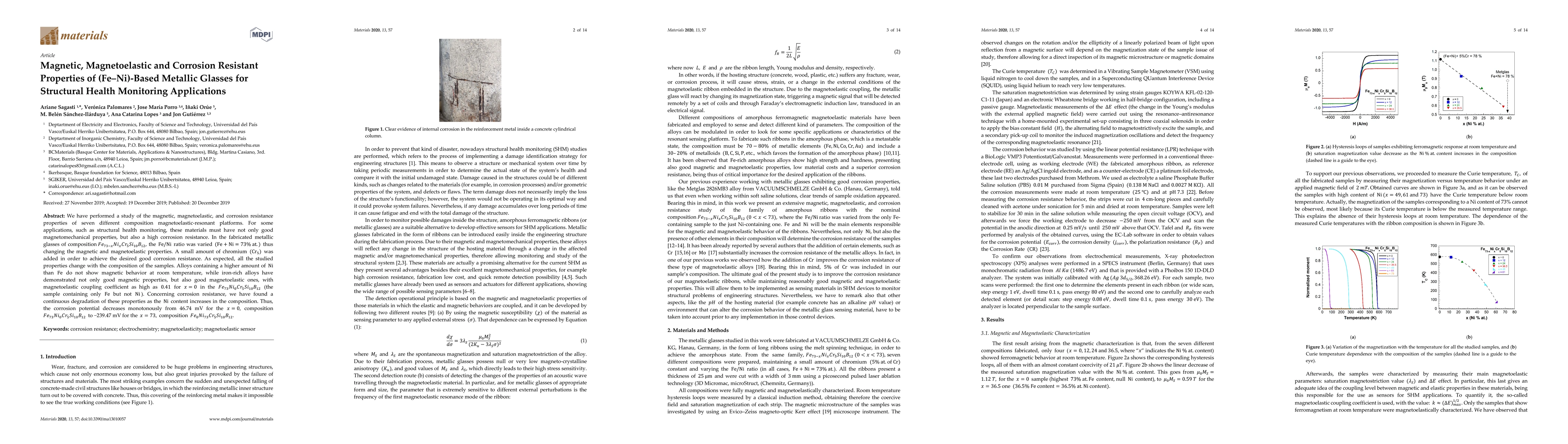 This study investigates the magnetic, magnetoelastic, and corrosion resistance properties of Fe-Ni based metallic glasses with varying Fe/Ni ratios for structural health monitoring. Iron-rich alloys exhibit strong magnetic and magnetoelastic properties, while increased Ni content degrades corrosion resistance, highlighting the trade-off between these properties.