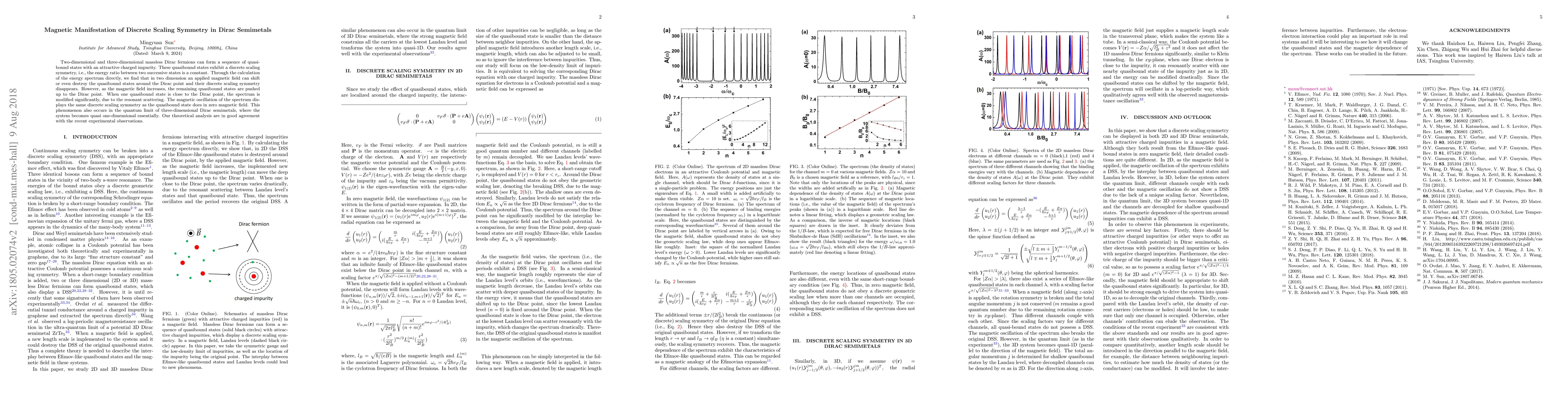 Two-dimensional and three-dimensional massless Dirac fermions can form a sequence of quasibound states with an attractive charged impurity. These quasibound states exhibit a discrete scaling symmetry, i.e., the energy ratio between two successive states is a constant. Through the calculation of the energy spectrum directly, we find that in two dimension an applied magnetic field can shift or even destroy the quasibound states around the Dirac point and their discrete scaling symmetry disappears. However, as the magnetic field increases, the remaining quasibound states are pushed up to the Dirac point. When one quasibound state is close to the Dirac point, the spectrum is modified significantly, due to the resonant scattering. The magnetic oscillation of the spectrum displays the same discrete scaling symmetry as the quasibound state does in zero magnetic field. This phenomenon also occurs in the quantum limit of three-dimensional Dirac semimetals, where the system becomes quasi one-dimensional essentially. Our theoretical analysis are in good agreement with the recent experimental observations.