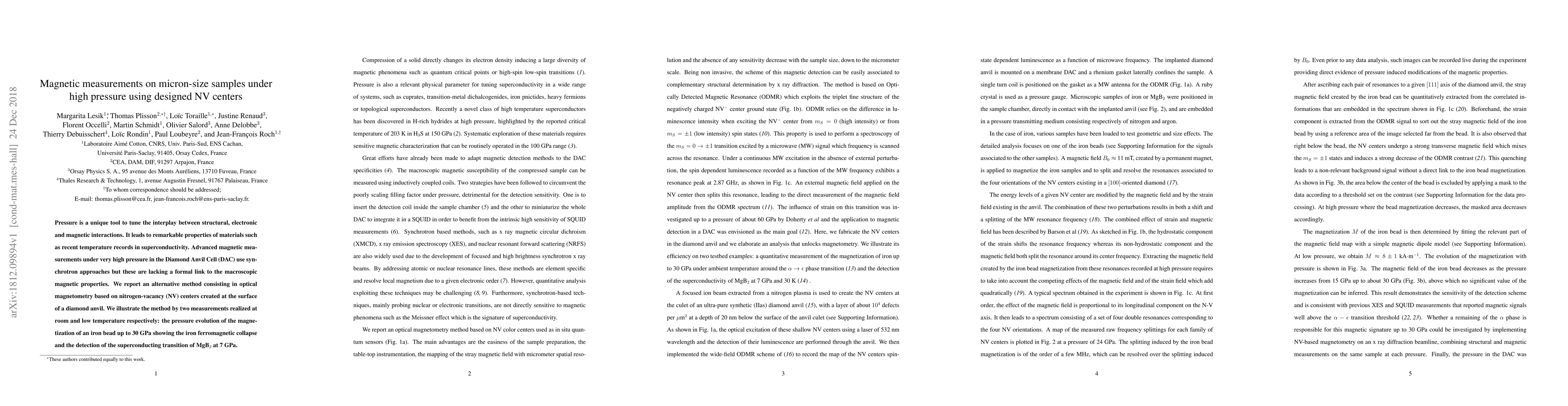 This paper presents a novel optical magnetometry technique using nitrogen-vacancy (NV) centers in diamonds for magnetic measurements on micron-size samples under high pressure. The method successfully demonstrates the pressure-induced ferromagnetic collapse in iron and the superconducting transition in MgB2 at specific pressures.