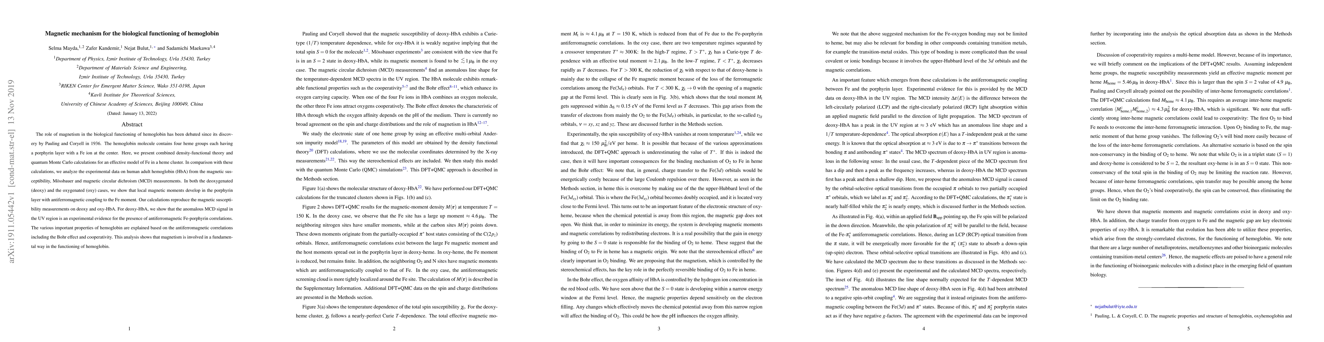 The role of magnetism in the biological functioning of hemoglobin has been debated since its discovery by Pauling and Coryell in 1936. The hemoglobin molecule contains four heme groups each having a porphyrin layer with a Fe ion at the center. Here, we present combined density-functional theory and quantum Monte Carlo calculations for an effective model of Fe in a heme cluster. In comparison with these calculations, we analyze the experimental data on human adult hemoglobin (HbA) from the magnetic susceptibility, Mossbauer and magnetic circular dichroism (MCD) measurements. In both the deoxygenated (deoxy) and the oxygenated (oxy) cases, we show that local magnetic moments develop in the porphyrin layer with antiferromagnetic coupling to the Fe moment. Our calculations reproduce the magnetic susceptibility measurements on deoxy and oxy-HbA. For deoxy-HbA, we show that the anomalous MCD signal in the UV region is an experimental evidence for the presence of antiferromagnetic Fe-porphyrin correlations. The various important properties of hemoglobin are explained based on the antiferromagnetic correlations including the Bohr effect and cooperativity. This analysis shows that magnetism is involved in a fundamental way in the functioning of hemoglobin.
